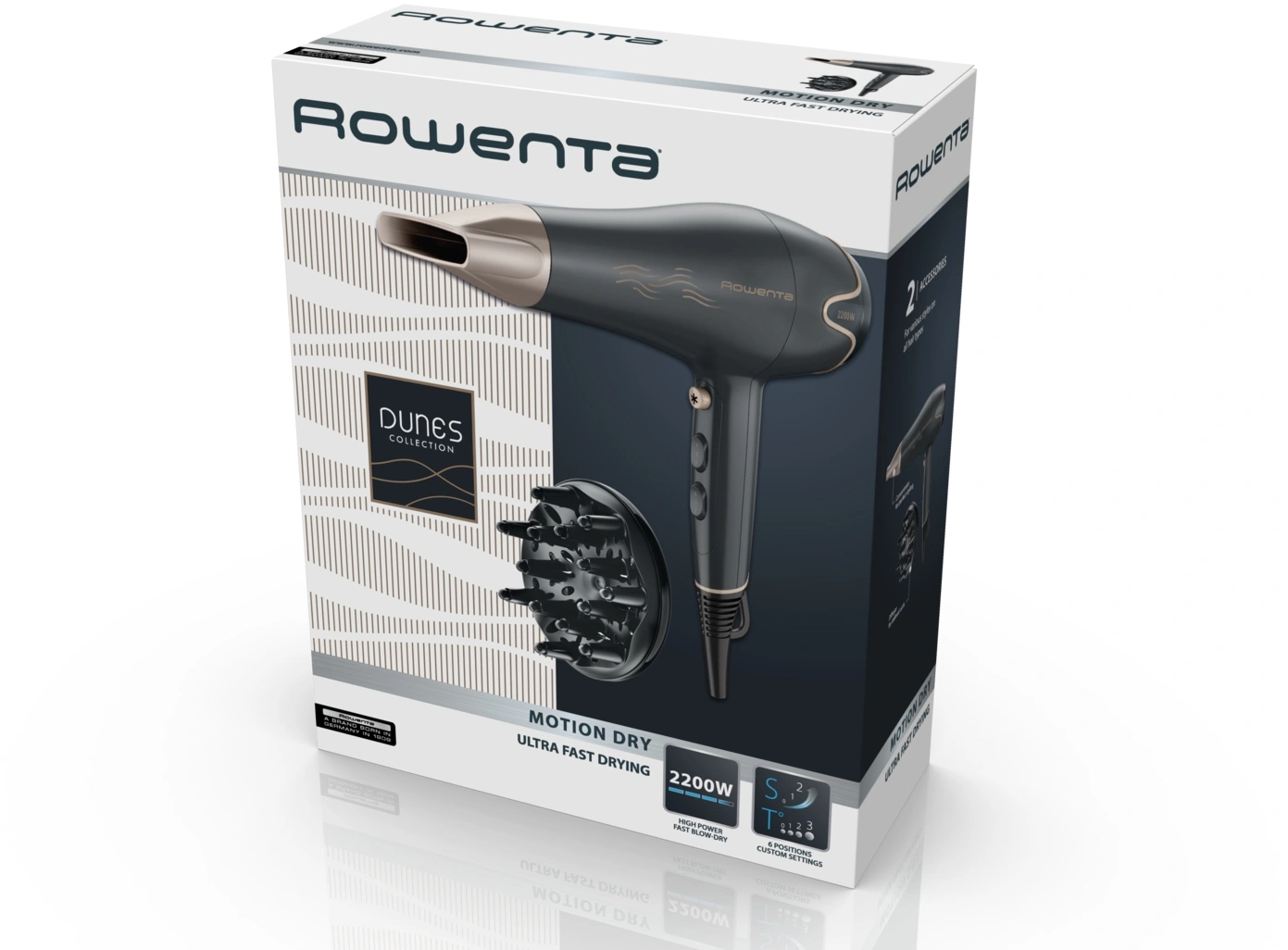 Фен Rowenta Motion Dry — это идеальный помощник, созданный для того, чтобы уход за волосами стал приятным и простым. Его мощный мотор мощностью 2200 Вт обеспечивает быстрый поток воздуха, позволяя высушить и уложить волосы всего за несколько минут. Удобное управление с шестью настройками скорости и