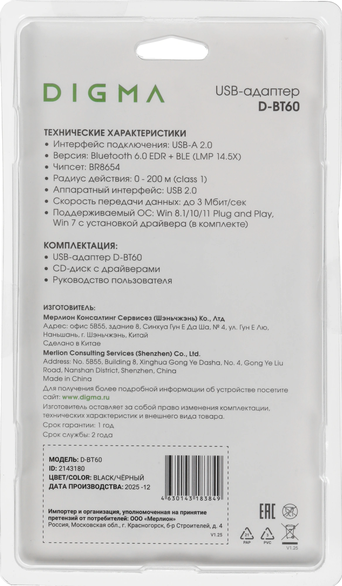 Bluetooth 6.0+EDR+BLE class 1 200м черный