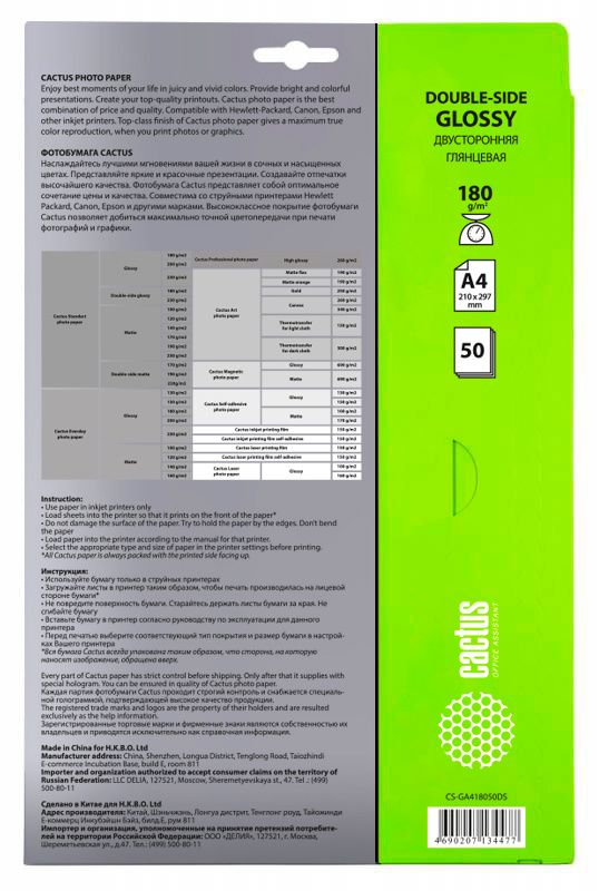 A4/180г/м2/50л./белый глянцевое/глянцевое для стру...