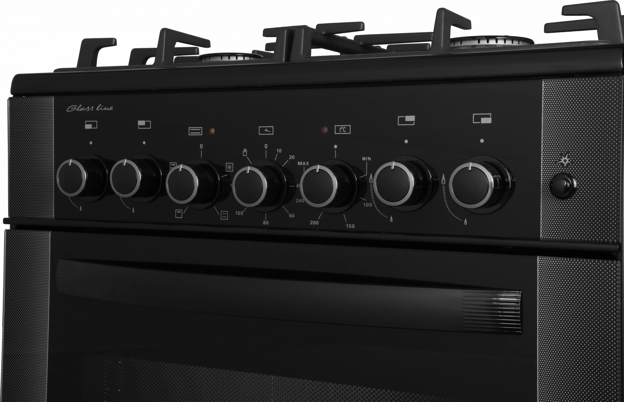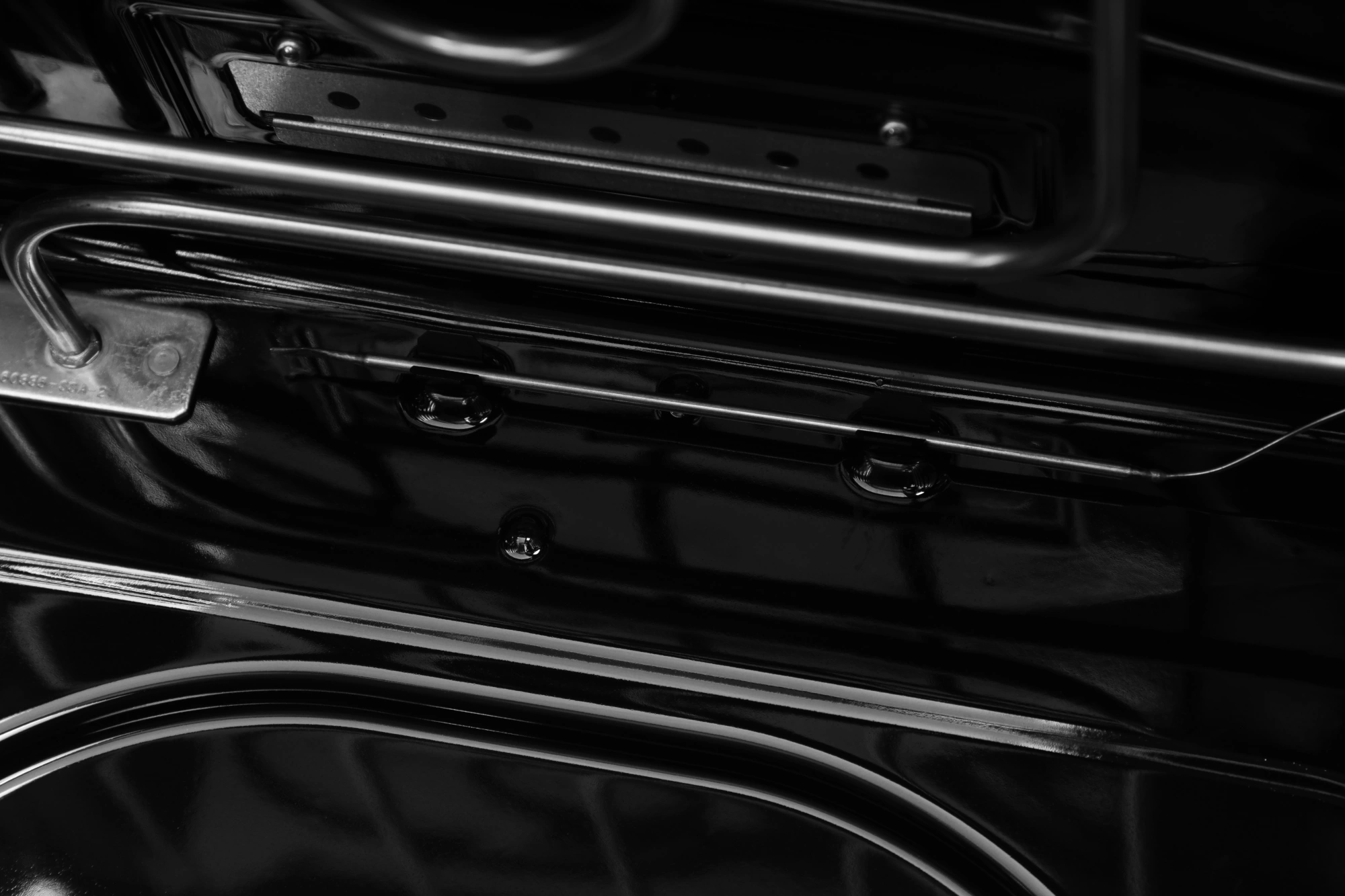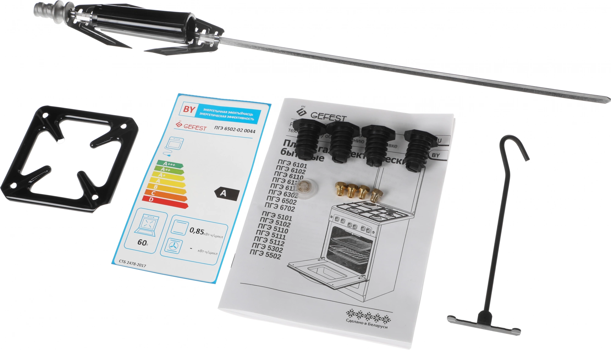 Вертел с электроприводом. Ножки регулировочные. Проволочные направляющие. Терморегулятор (термостат). Электророзжиг горелок, кнопка розжига на панели. Мощность гриля - 1200 Вт.