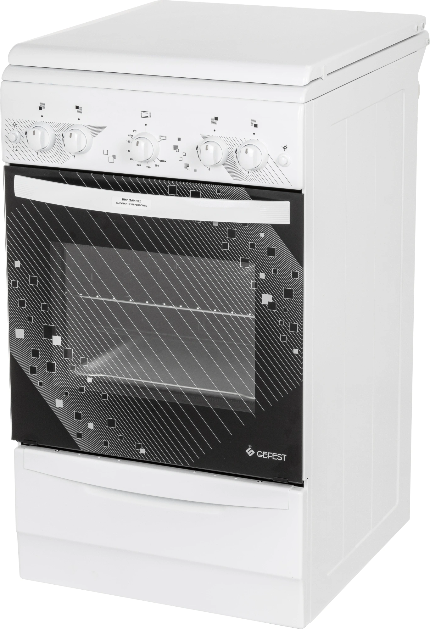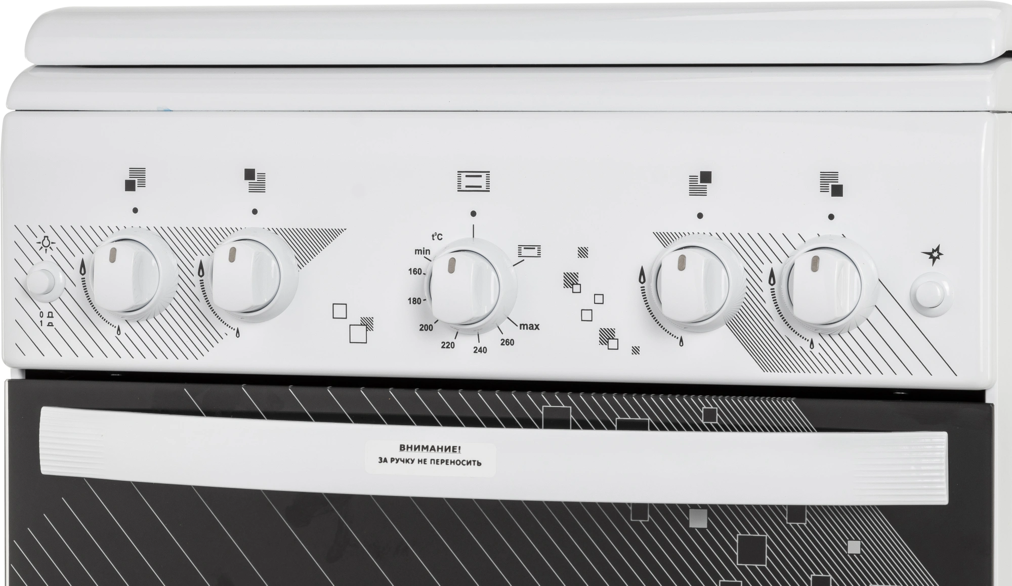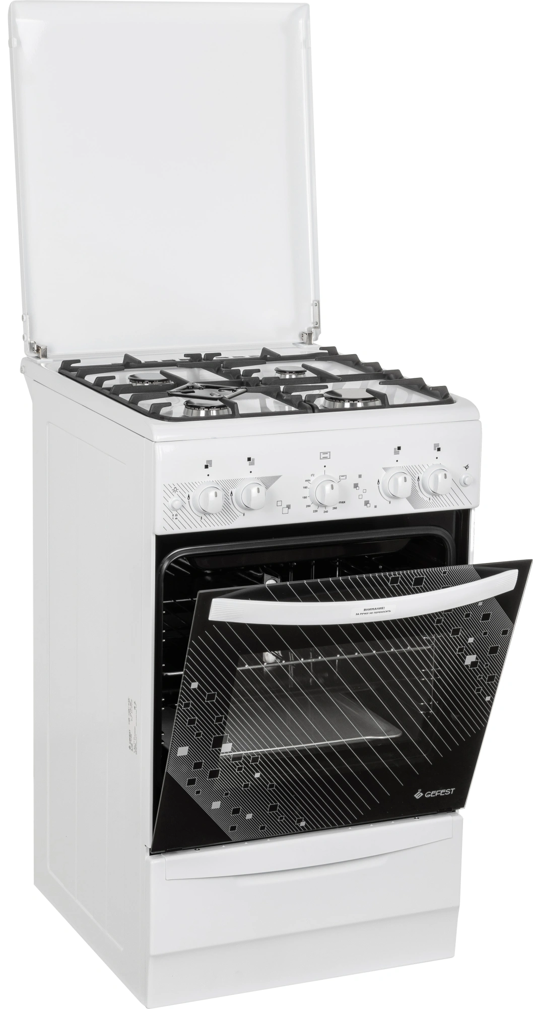 Ножки регулировочные. Проволочные направляющие. Терморегулятор (термостат). Электророзжиг горелок, кнопка розжига на панели. Электророзжиг духовки, кнопка розжига на панели. Мощность гриль-горелки: 1,9 кВт.