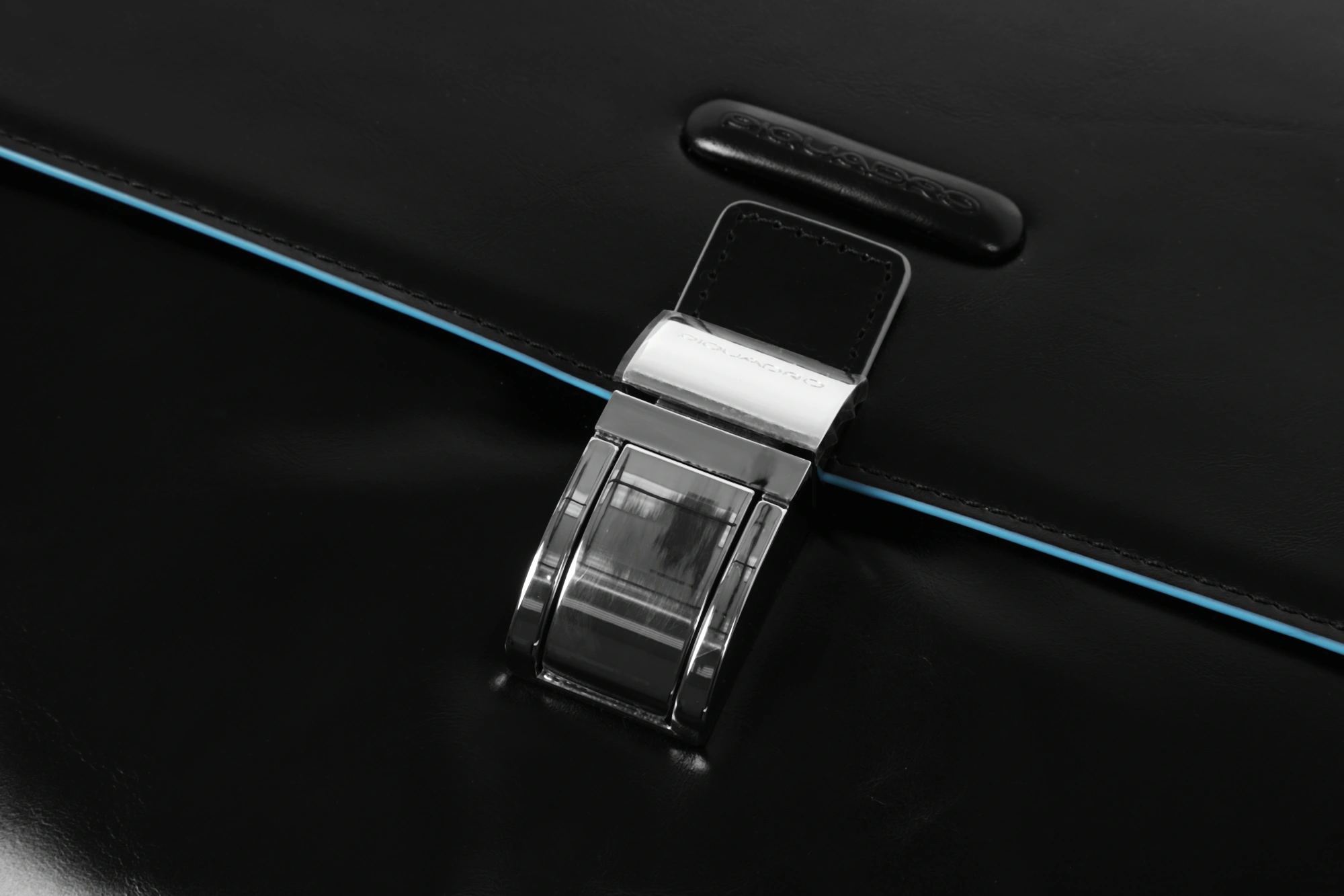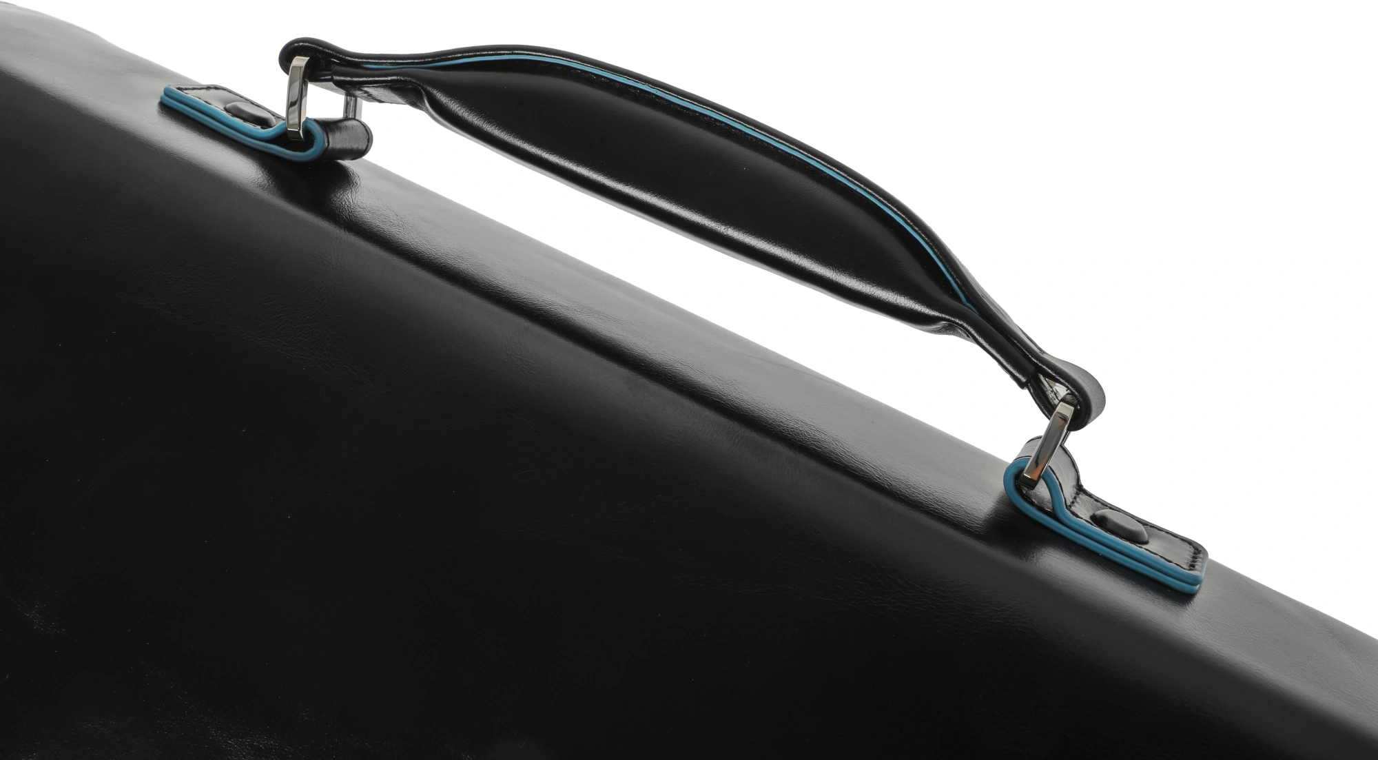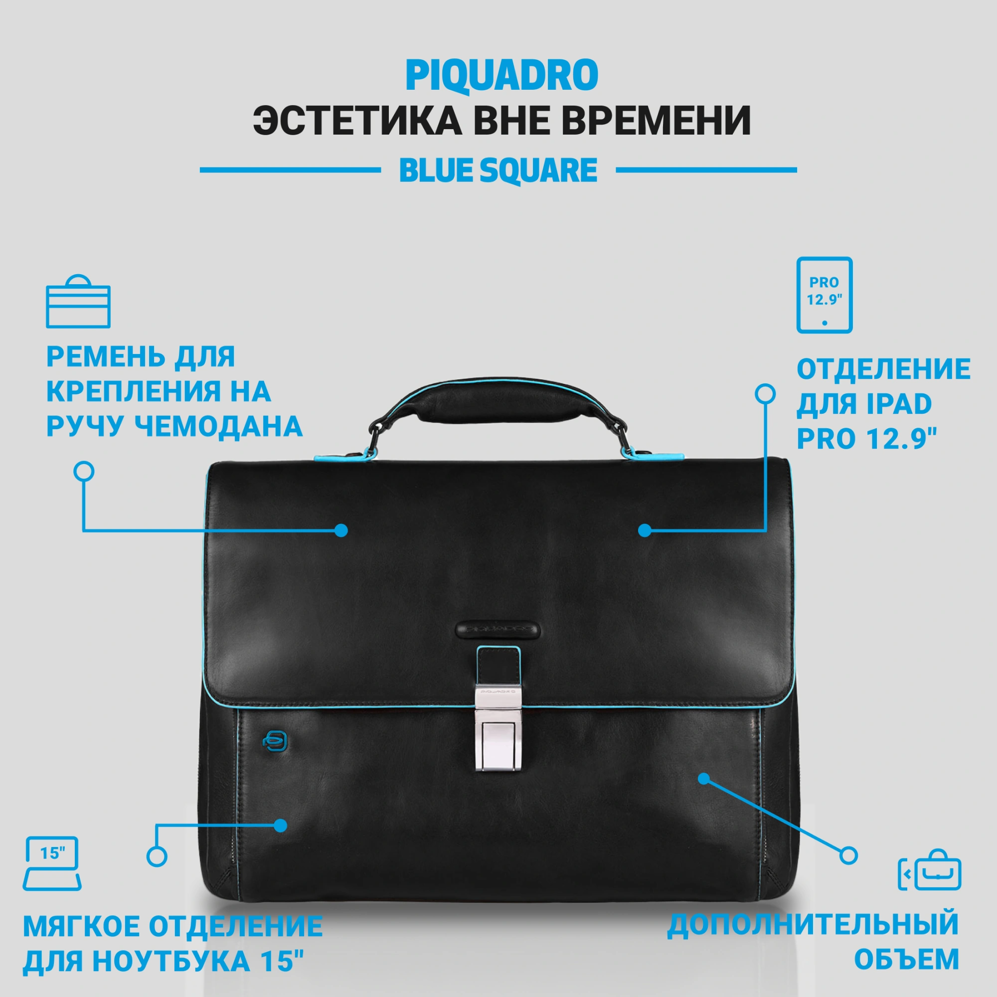 Натуральная кожа. Оторочка по канту, подкладка - голубым. Отделение для ноутбука (15,6" дюймов) с фиксацией, съемный плечевой ремень, карманы для мобильного телефона, ручки и мелких вещей. Система крепления к ручке багажной сумки. Одно основное отделение. Возможность расширения.