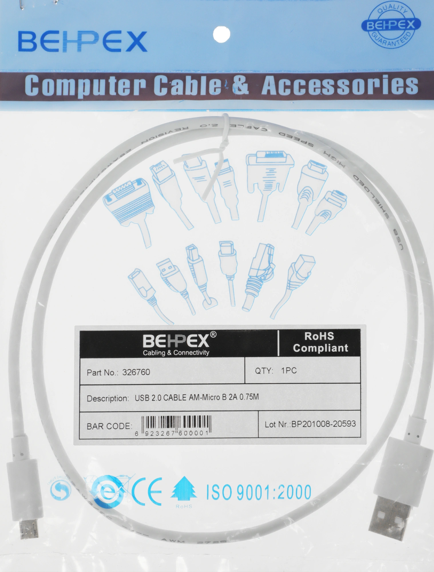Кабель USB для передачи данных между персональными компьютерами и смартфонами, планшетами, MP3-плеерами, а также прочими устройствами с портом micro USB. Длина кабеля 0,75 метра.