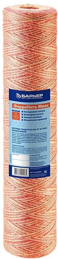 Специальный способ намотки хелатного материала с волокнистым ионитом позволяет задерживать растворенное, окисленное железо в том числе коллоидное, ионы тяжелых металлов, а также механические примеси. Фильтроэлемент предназначен для использования в бытовых водоочистителях стандарта Big Blue 20.