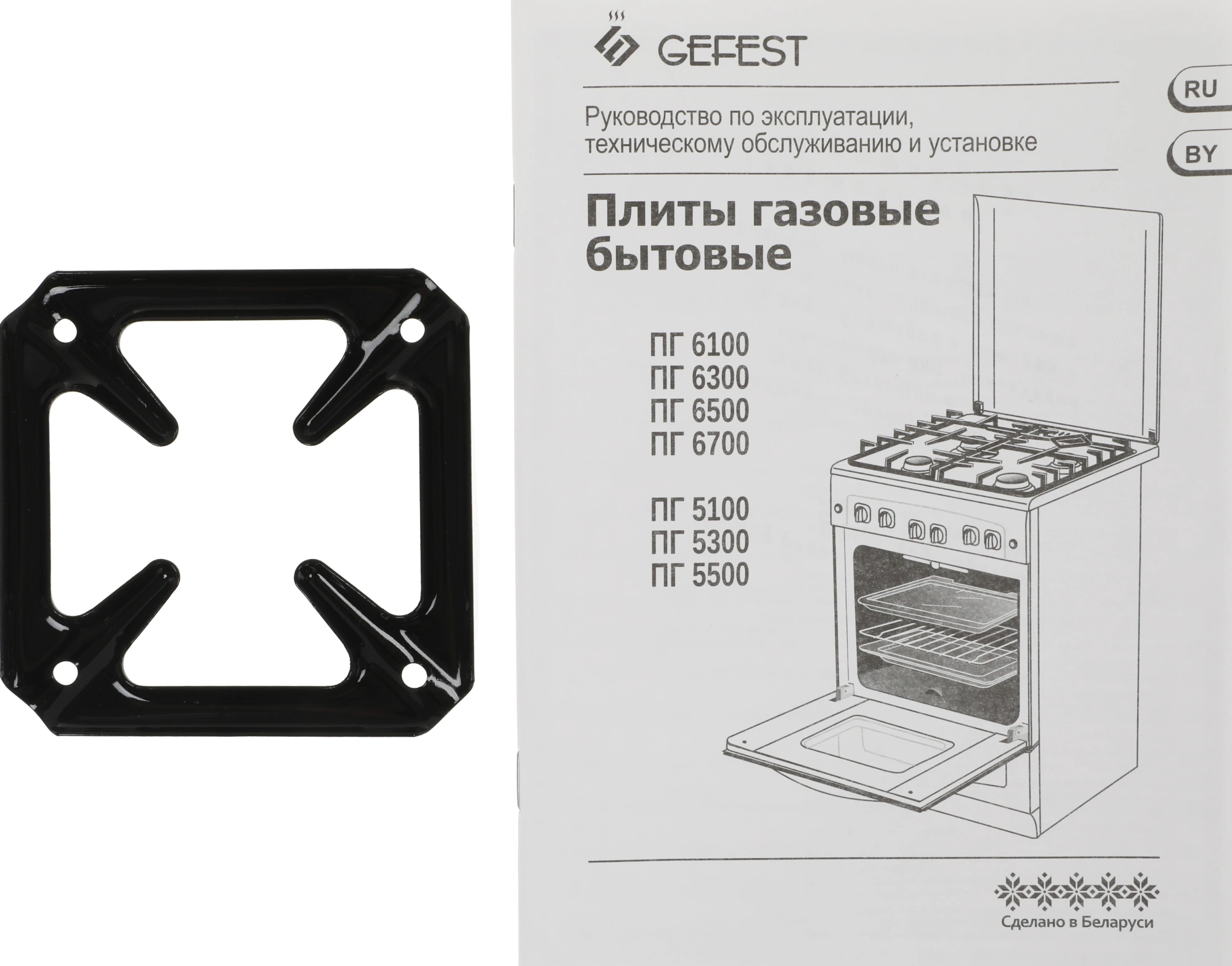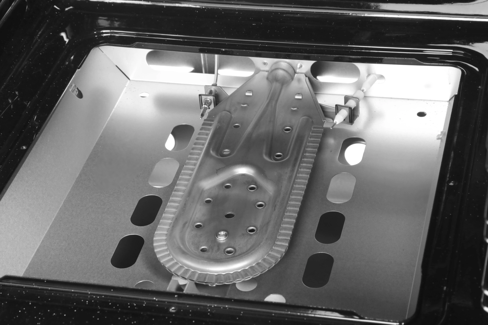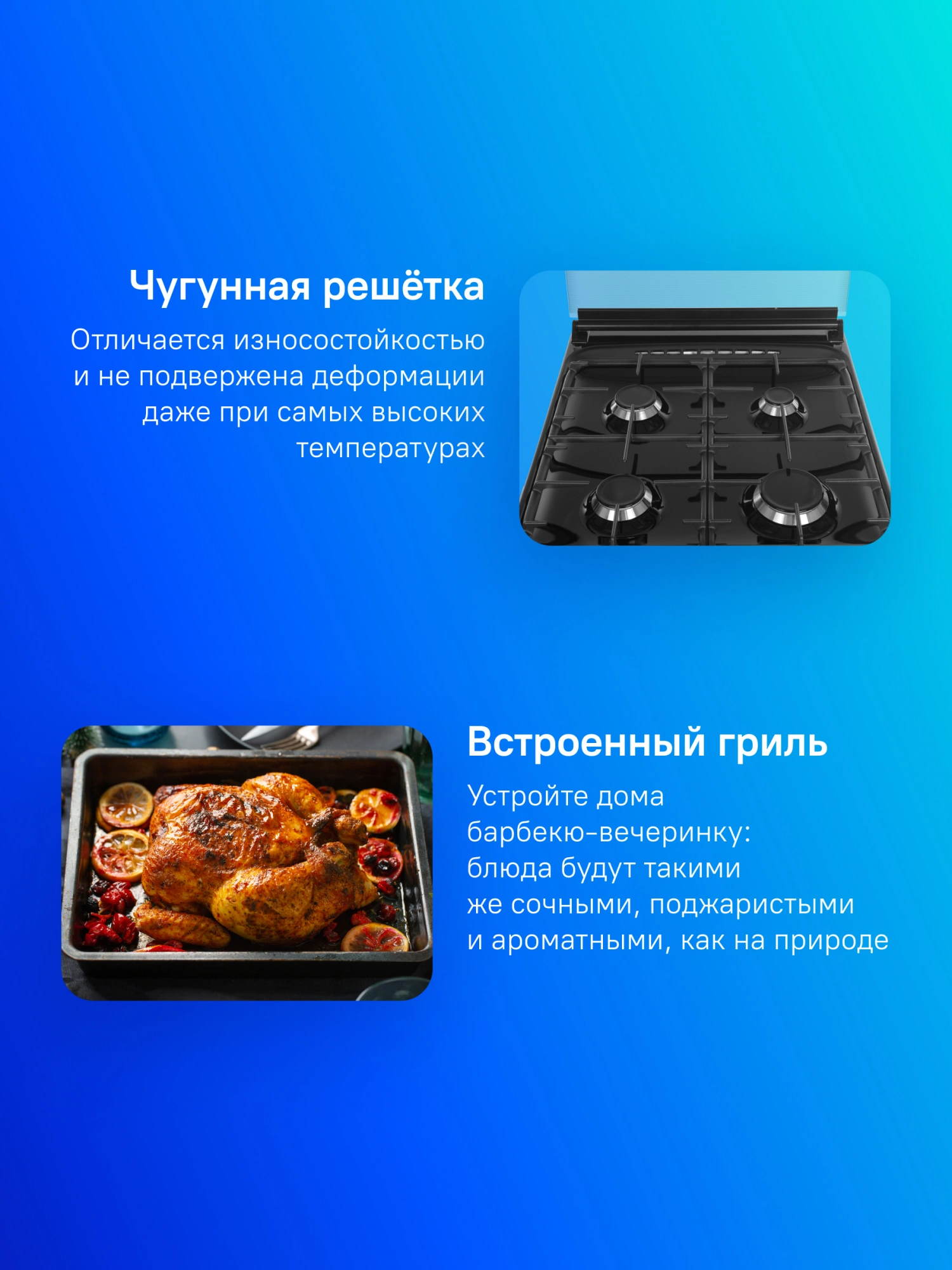 Вертел с электроприводом. Ножки регулировочны. Проволочные направляющие. Терморегулятор (термостат). Электророзжиг горелок, кнопка розжига на панели. Электророзжиг духовки, кнопка розжига на панели.