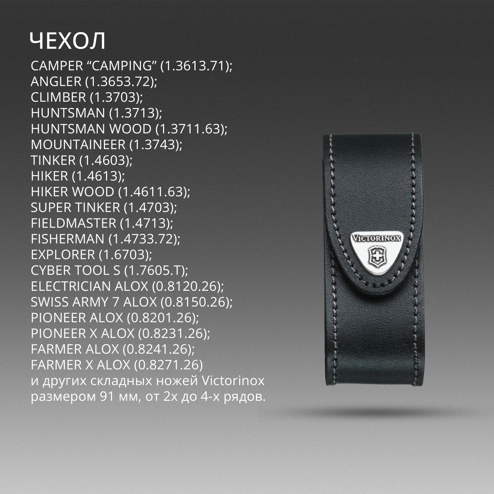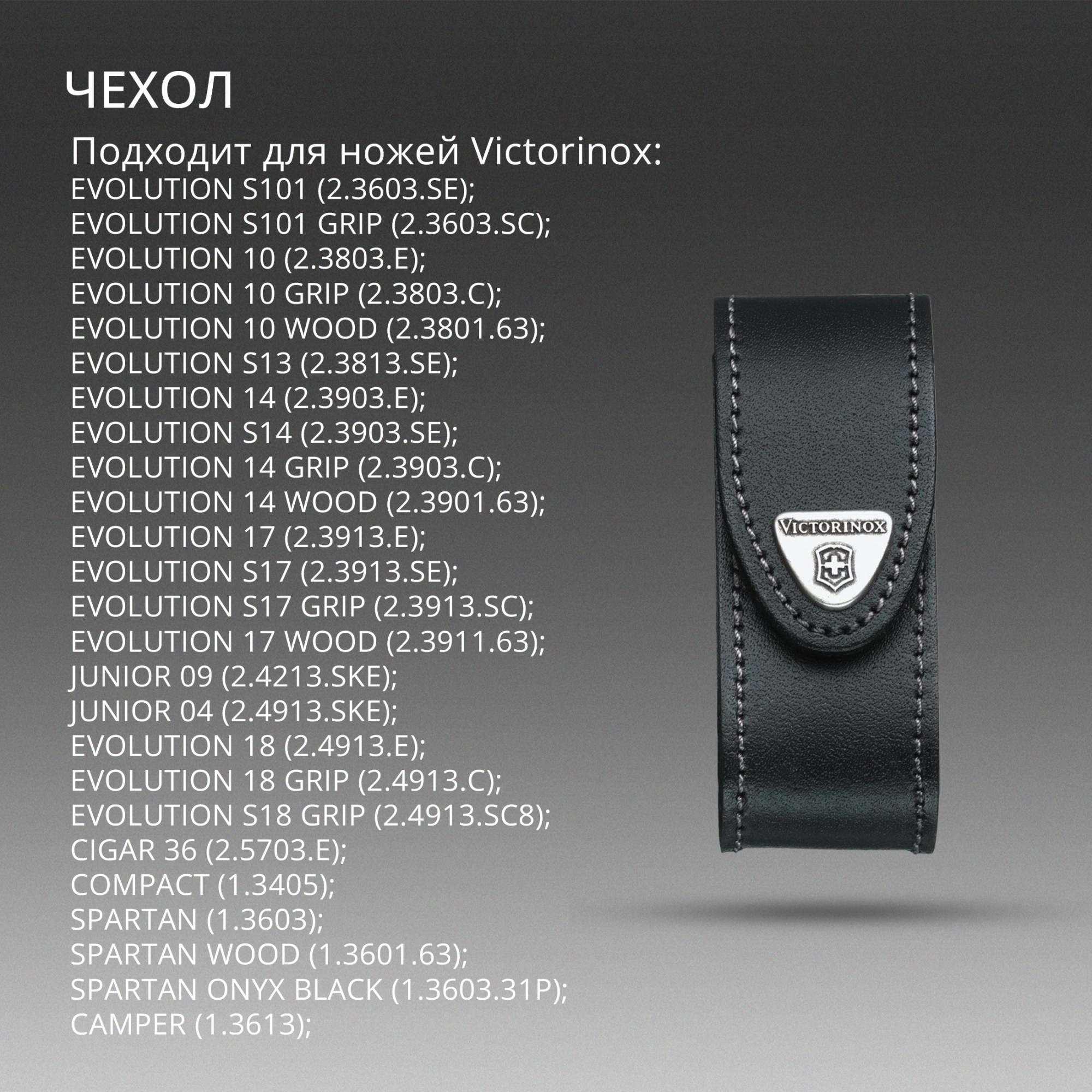Подходит для ножей: EVOLUTION S101 (2.3603.SE); EVOLUTION S101 GRIP (2.3603.SC); EVOLUTION 10 (2.3803.E); EVOLUTION 10 GRIP (2.3803.C); EVOLUTION 10 WOOD (2.3801.63); EVOLUTION S13 (2.3813.SE); EVOLUTION 14 (2.3903.E); EVOLUTION S14 (2.3903.SE); EVOLUTION 14 GRIP (2.3903.C); EVOLUTION 14 WOOD (2.3901.63); EVOLUTION 17 (2.3913.E); EVOLUTION S17 (2.3913.SE); EVOLUTION S17 GRIP (2.3913.SC); EVOLUTION 17 WOOD (2.3911.63); JUNIOR 09 (2.4213.SKE); JUNIOR 04 (2.4913.SKE); EVOLUTION 18 (2.4913.E); EVOLUTION 18 GRIP (2.4913.C); EVOLUTION S18 GRIP (2.4913.SC8); CIGAR 36 (2.5703.E); COMPACT (1.3405); SPARTAN (1.3603); SPARTAN WOOD (1.3601.63); SPARTAN ONYX BLACK (1.3603.31P); CAMPER (1.3613); CAMPER “CAMPING” (1.3613.71); ANGLER (1.3653.72); CLIMBER (1.3703); HUNTSMAN (1.3713); HUNTSMAN WOOD (1.3711.63); MOUNTAINEER (1.3743); TINKER (1.4603); HIKER (1.4613); HIKER WOOD (1.4611.63); SUPER TINKER (1.4703); FIELDMASTER (1.4713); FISHERMAN (1.4733.72); EXPLORER (1.6703); CYBER TOOL S (1.7605.T); ELECTRICIAN ALOX (0.8120.26); SWISS ARMY 7 ALOX (0.8150.26); PIONEER ALOX (0.8201.26); PIONEER X ALOX (0.8231.26); FARMER ALOX (0.8241.26); FARMER X ALOX (0.8271.26)