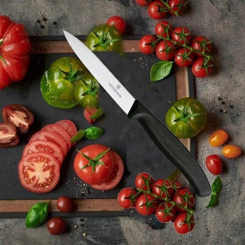 Нож для разделки - это незаменимый инструмент любого повара для точных работ на кухне, а нож Swiss Classic Paring Knife с лезвием длиной 10 см привлекает внимание не только своей свежей цветовой палитрой, но также острой кромкой и заостренным кончиком. Вы искусно удалите семена из перца, быстро очистите яблоко от сердцевины, нарежете овощи брусочками, мелко или идеальными квадратиками - какую бы работу вы ни поручили этому ножу, его гладкие и равномерные срезы приведут к тому, что ваши блюда будут столь же красивыми, сколь и питательными.