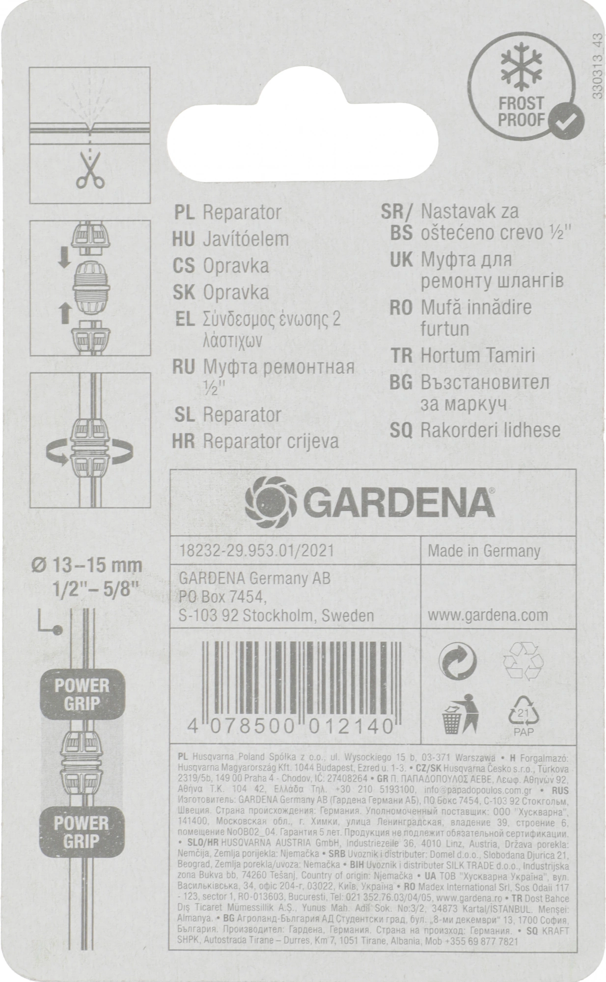 Для быстрого ремонта шлангов. Вырежьте поврежденный участок, соедините образовавшиеся концы с помощью этой муфты, и шланг снова готов к работе. Новая затяжная гайка позволяет более эффективно соединить шланг с муфтой. Подходит для ремонта шлангов диаметром 13 мм (1/2").