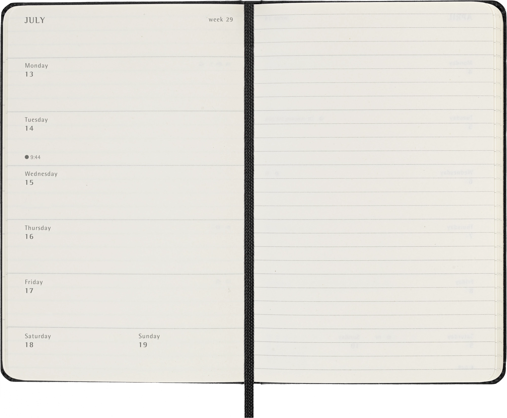 Еженедельник- записная книжка MOLESKINE формата pocket, на левой странице которого отображаются намеченные на текущую неделю встречи, а правая линованная страница предназначена для записи заметок и идей. Такой формат делает планировщик удобным и многофункциональным.