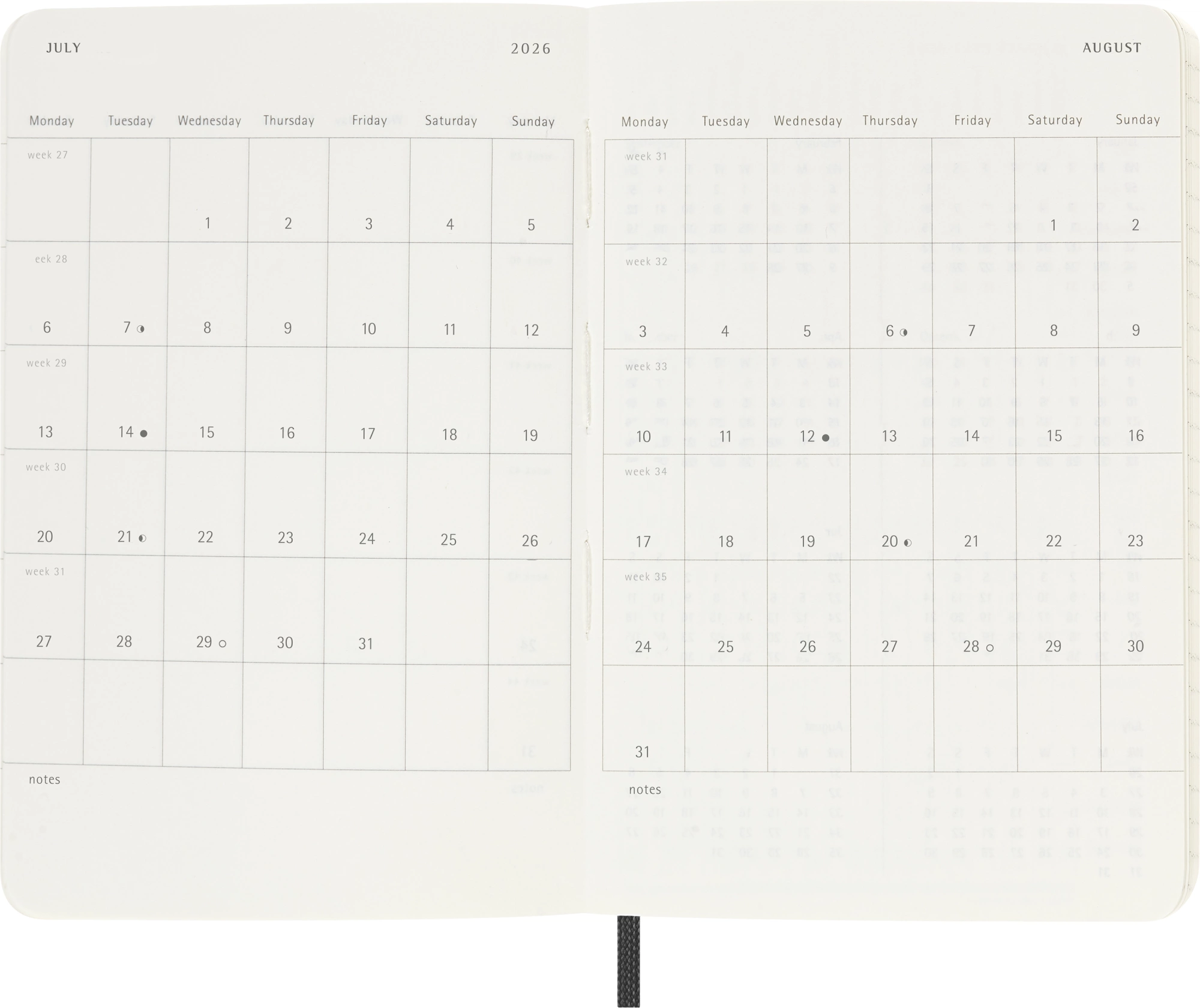 Еженедельник- записная книжка MOLESKINE формата pocket, на левой странице которого отображаются намеченные на текущую неделю встречи, а правая линованная страница предназначена для записи заметок и идей. Такой формат делает планировщик удобным и многофункциональным.