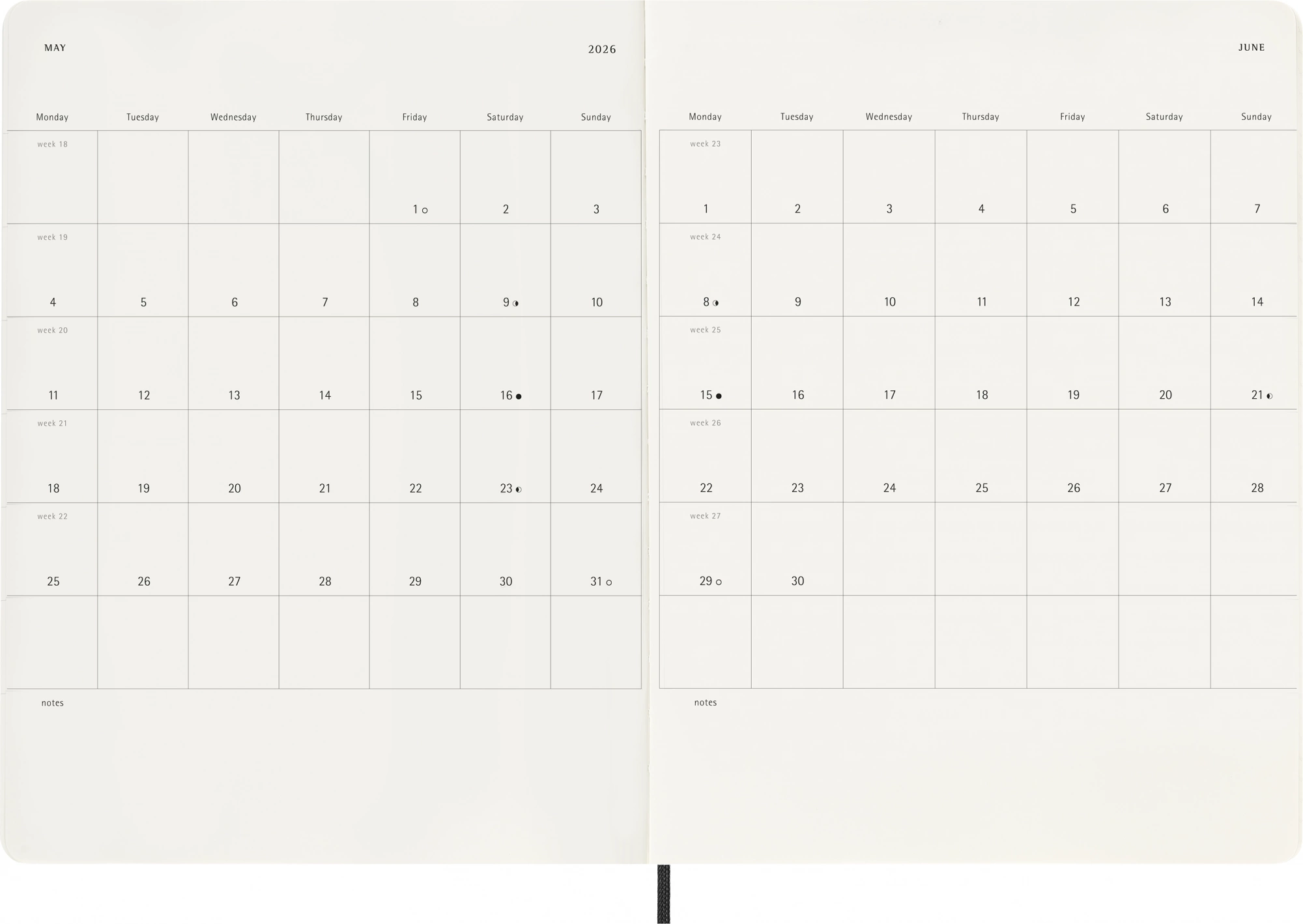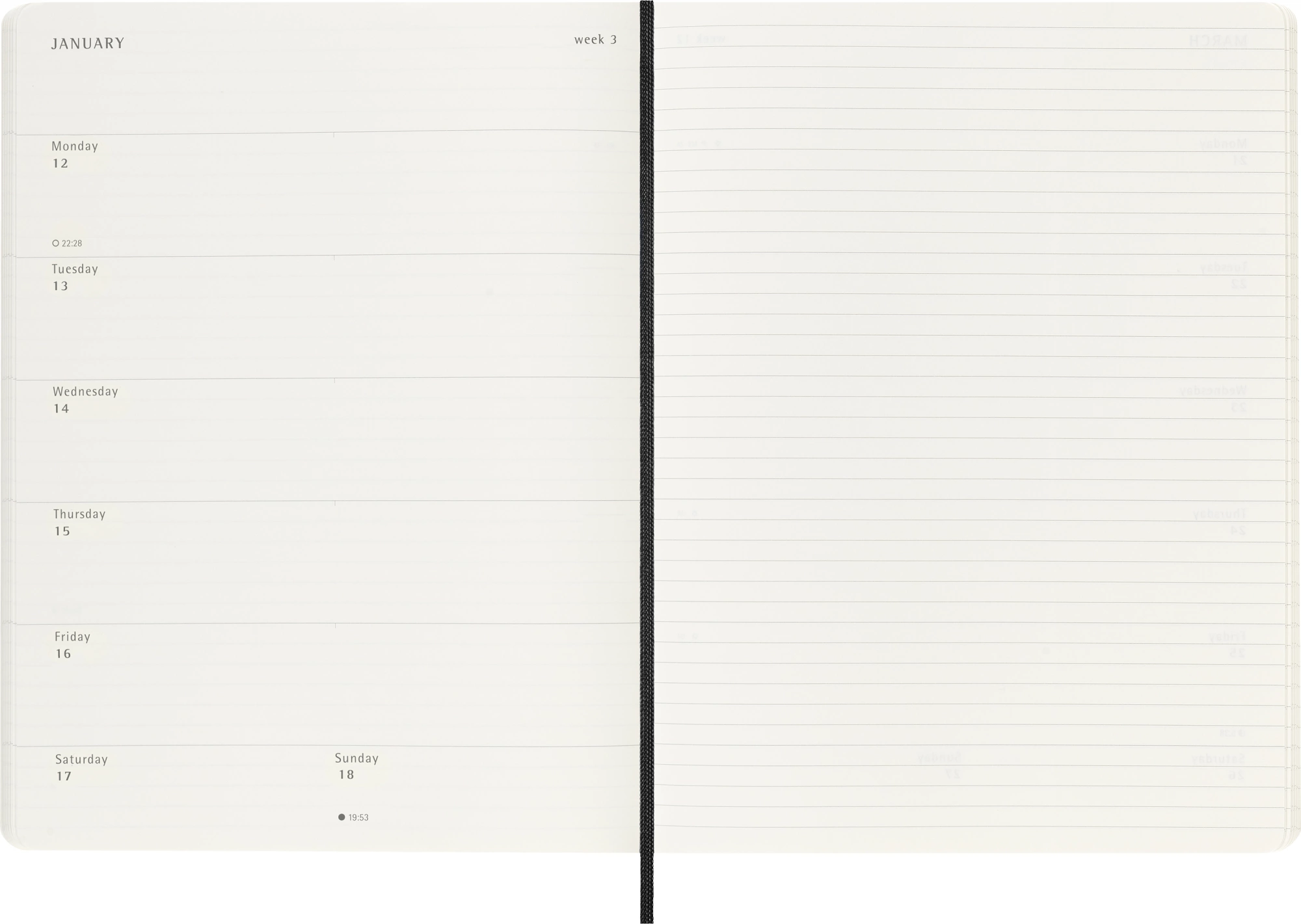 Еженедельник- записная книжка MOLESKINE формата extra large, на левой странице которого отображаются намеченные на текущую неделю встречи, а правая линованная страница предназначена для записи заметок и идей. Такой формат делает планировщик удобным и многофункциональным.