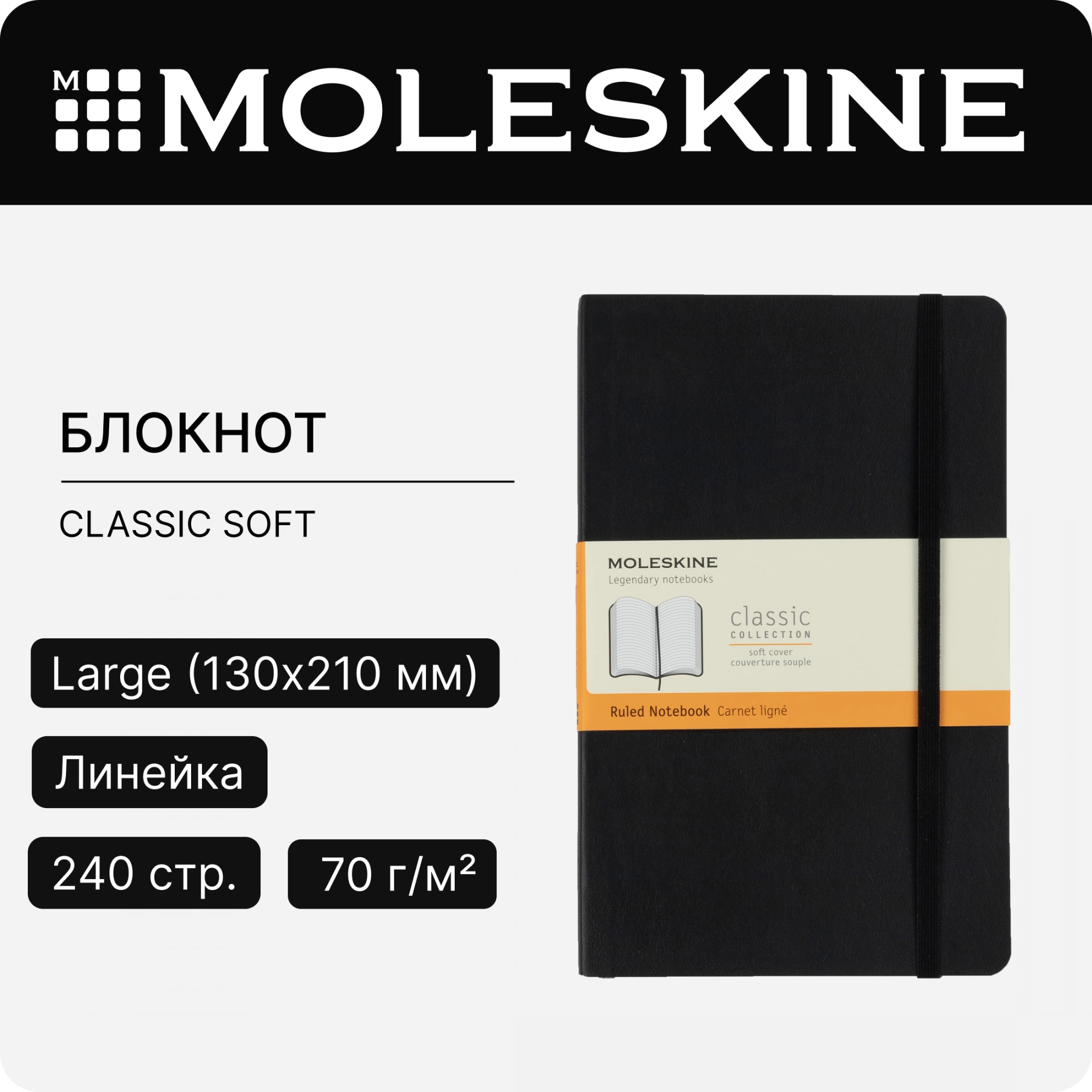 Этот простой, но уже ставший классикой блокнот размера large в линейку является одним из самых популярных изделий Moleskine. Этот надежный спутник, идеально подходящий для подсчетов, записи мыслей и заметок, выполнен в картонной обложке со скругленными углами, с листами из бескислотной бумаги, закладкой, эластичной застежкой и вместительным внутренним карманом, куда вложена карточка с историей Moleskine.