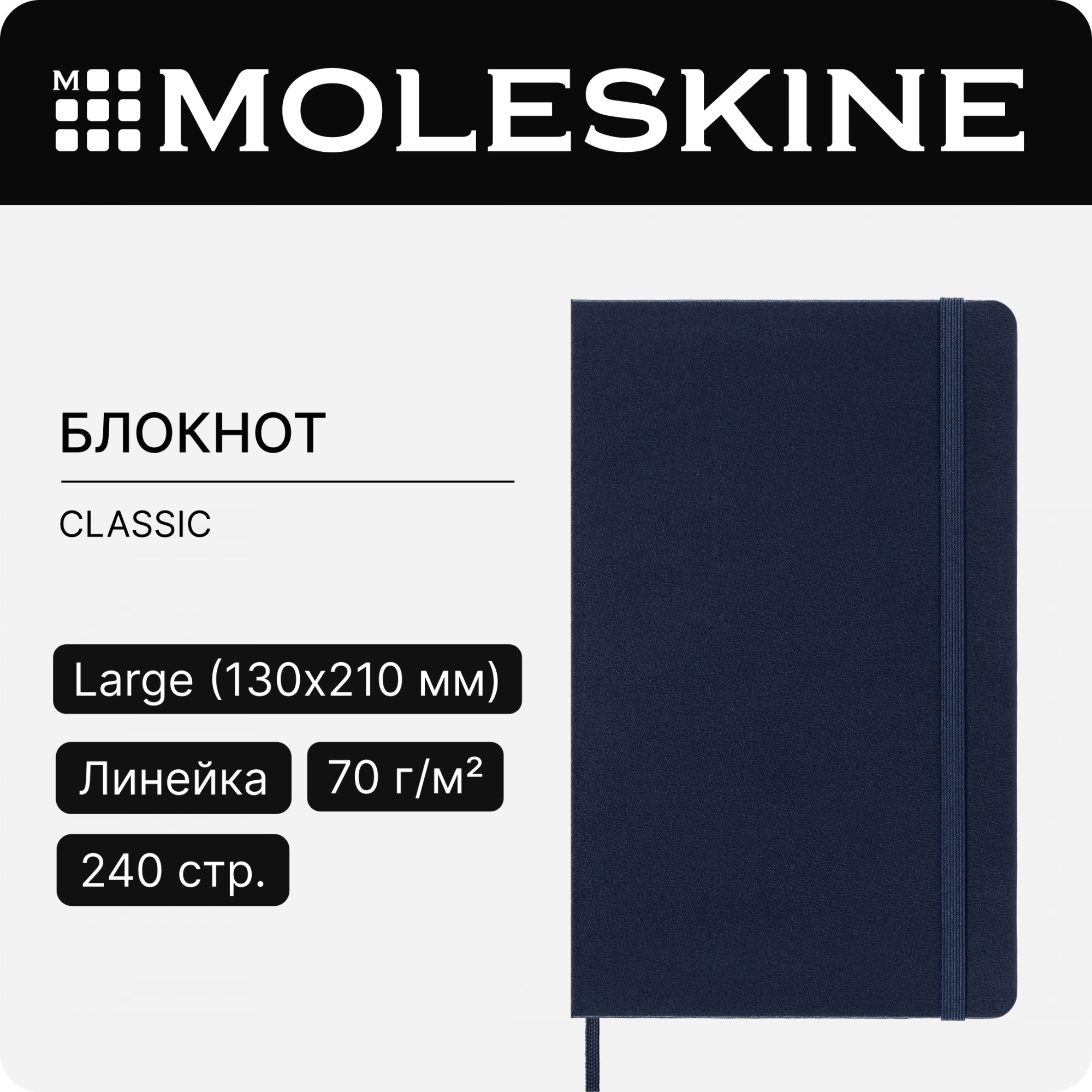 Блокнот классической коллекции размера large в новом благородном цвете синий сапфир с линованными страницами, которые только и ждут того, чтобы вы заполнили их своими идеями. Блокнот имеет все характерные элементы легендарного блокнота MOLESKINE: закругленные углы, страницы цвета слоновой кости, эластичную застежку, закладку и расширяемый кармашек.