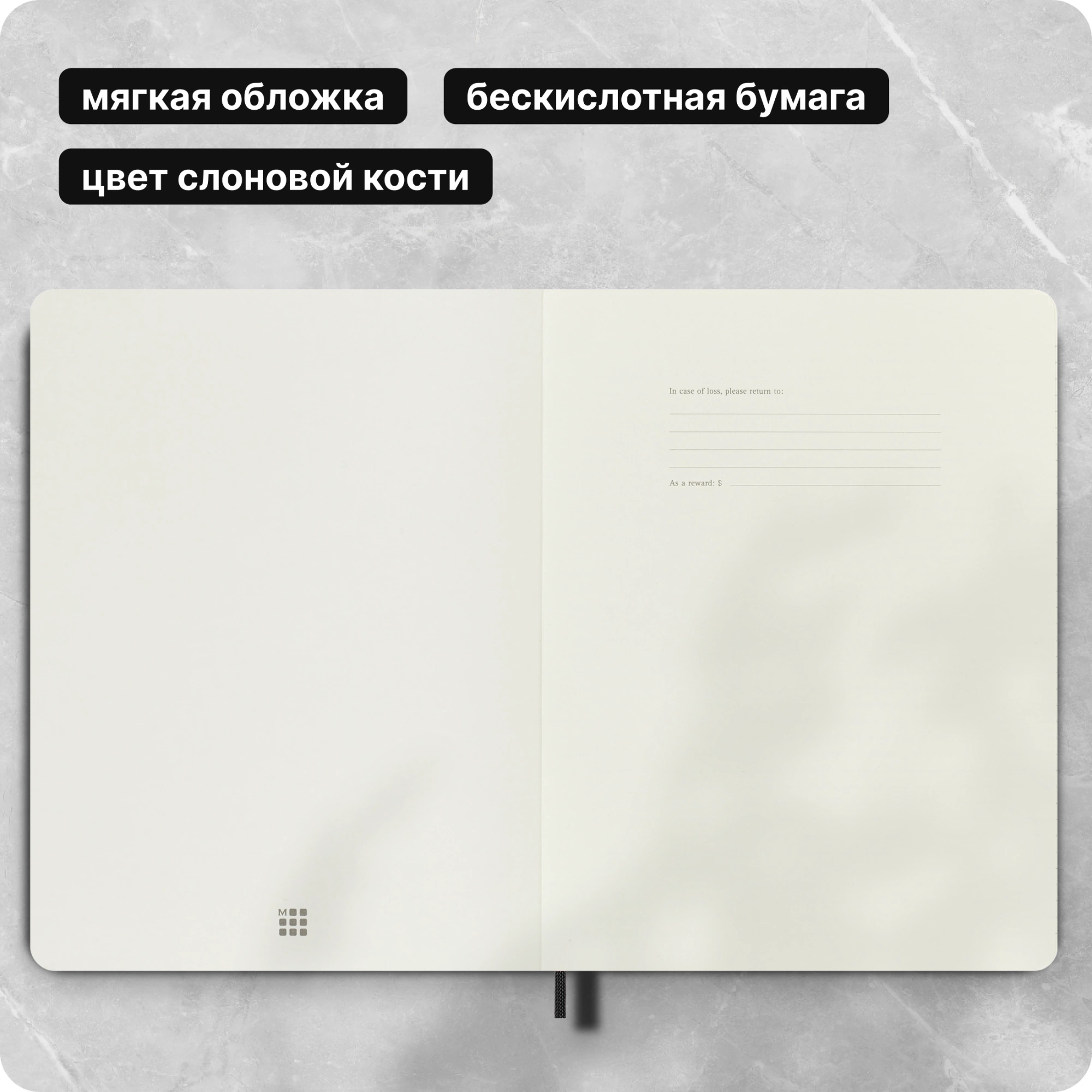 Эргономичный блокнот размера extra large в линейку в мягкой, но прочной обложке легко помещается в свернутом виде в карман. Он станет надежным спутником в путешествии и идеально подойдет для записи мыслей и заметок. Этот продукт выполнен в шитом переплете с мягкой обложкой со закругленными углами, закладкой, эластичной застежкой и вместительным внутренним карманом, куда вложена карточка с историей Moleskine.