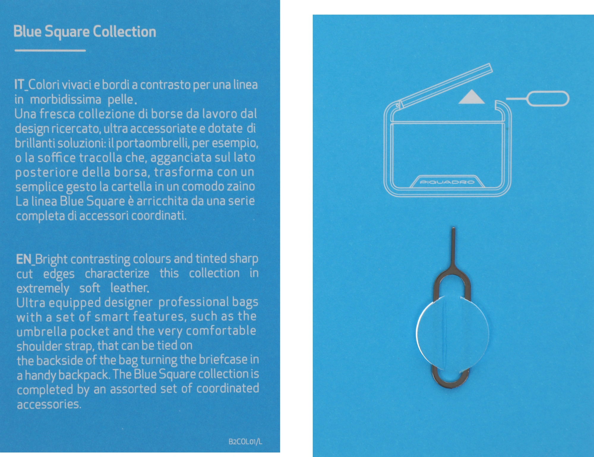 Коллекция Blue Square — это линейка сумок и рюкзаков из кожи, отличающиеся изысканным дизайном, богатым разнообразием аксессуаров и нестандартными решениями. Эта линейка дополняется коллекцией подходящих по стилю аксессуаров.