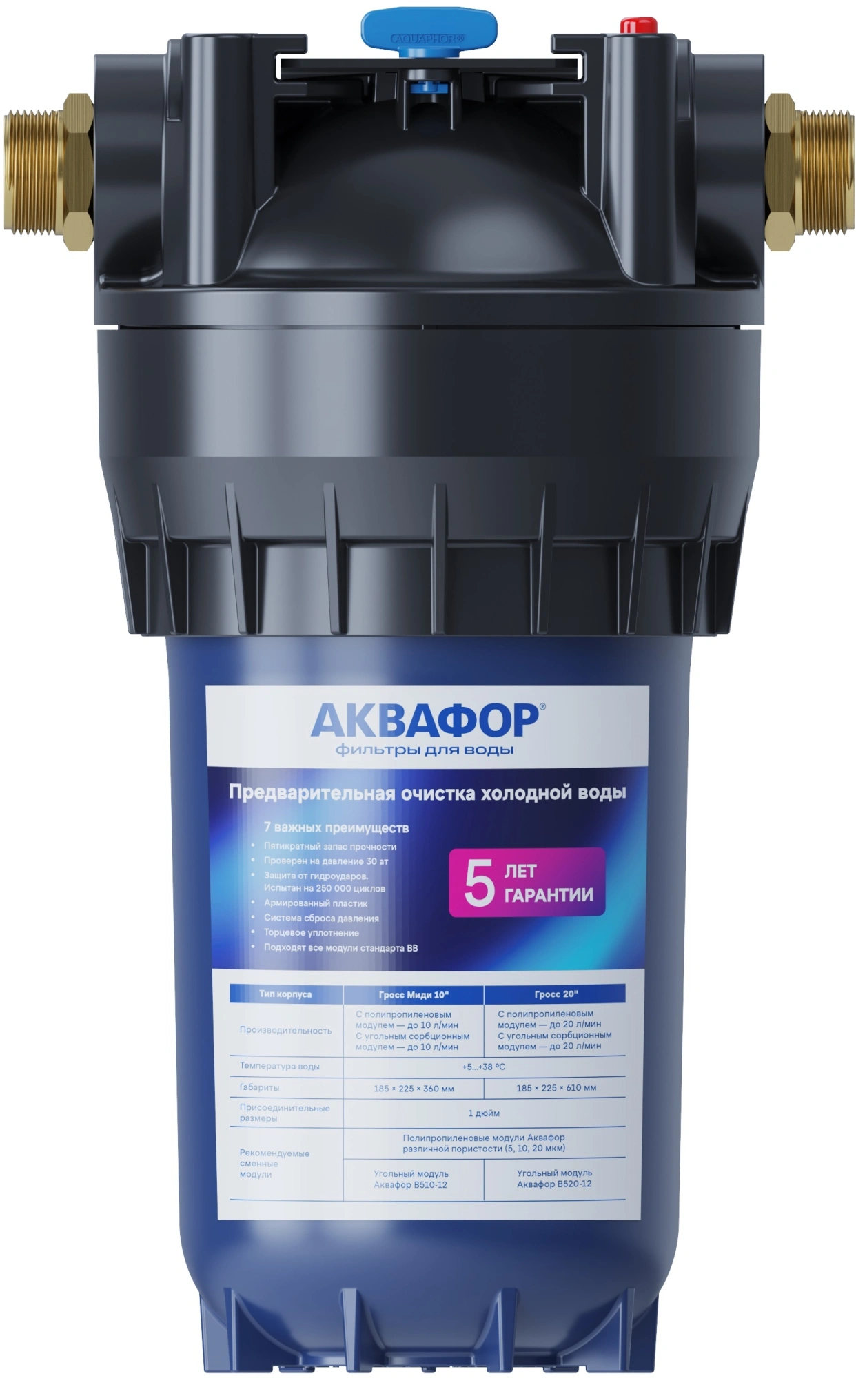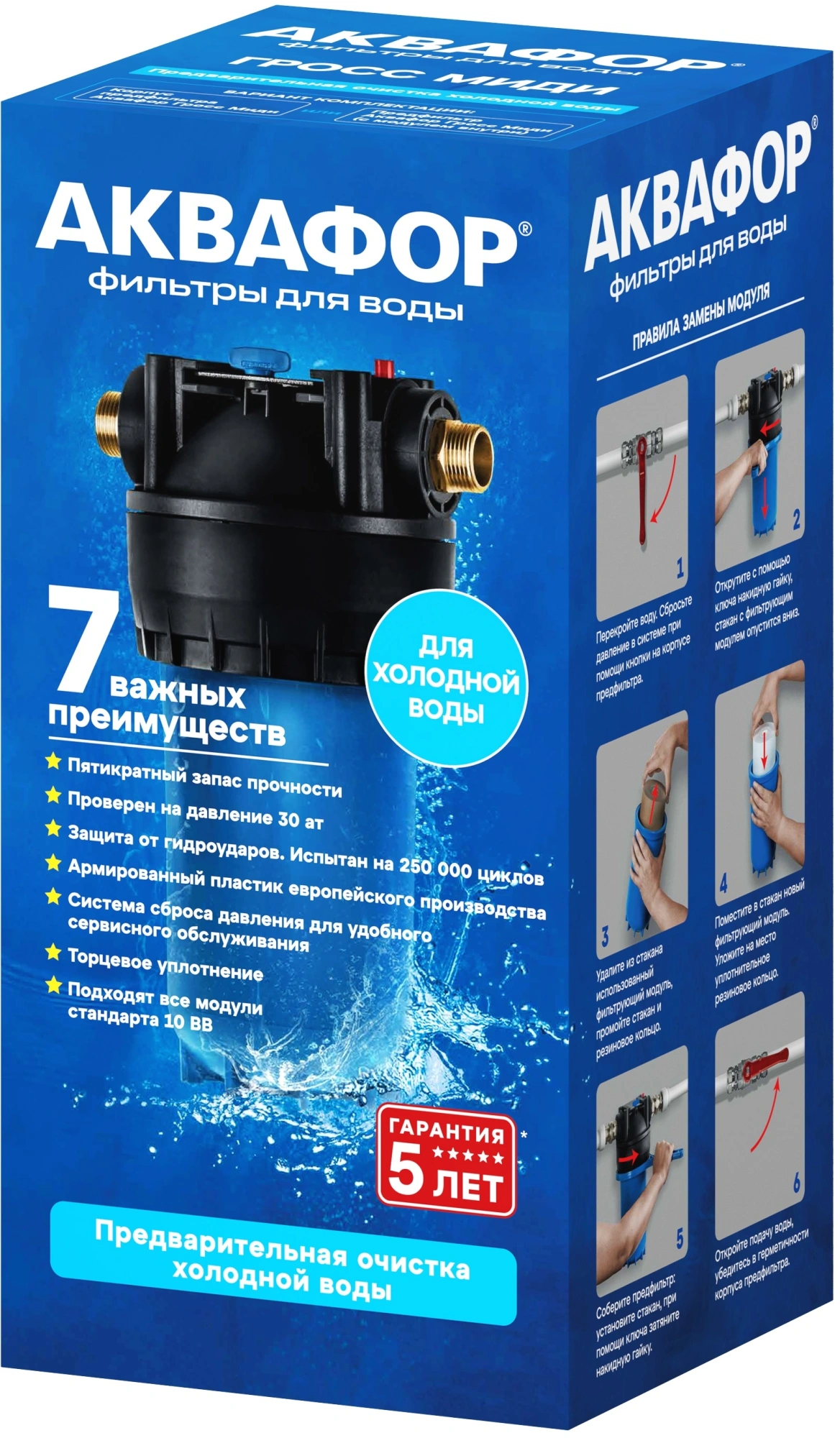 Аквафор Гросс Миди (10") - корпус предфильтра для холодной воды. Эффективно удаляя песок, ржавчину, взвесь и другие примеси, Аквафор Гросс Миди облегчает работу фильтра для питьевой воды, защищает бытовую технику от поломок, делает прием ванны или душа более приятным.