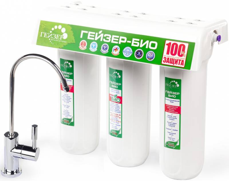 Трехступенчатый фильтр "Гейзер Био 321" для очистки воды с повышенным содержанием солей жесткости. Признаки жесткой воды: накипь белого цвета в чайнике, белый налет на сантехнике, пленка в чае. Самая совершенная и оптимальная система очистки воды для каждого дома. 100% защита от вирусов и бактерий.