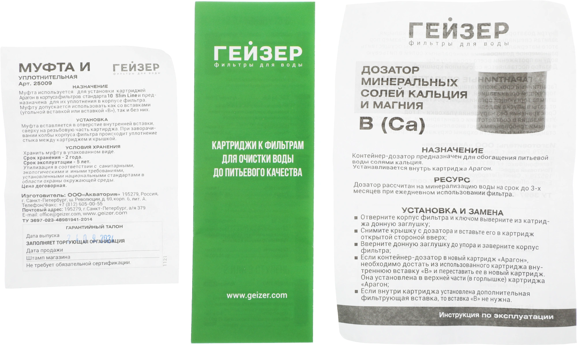Комплект картриджей Гейзер №9 предназначен для замены исчерпавших свой ресурс картриджей в стационарных трехступенчатых фильтрах для мягкой воды. Признаки мягкой воды: плохо смывается мыло и шампунь, коррозия сантехники.