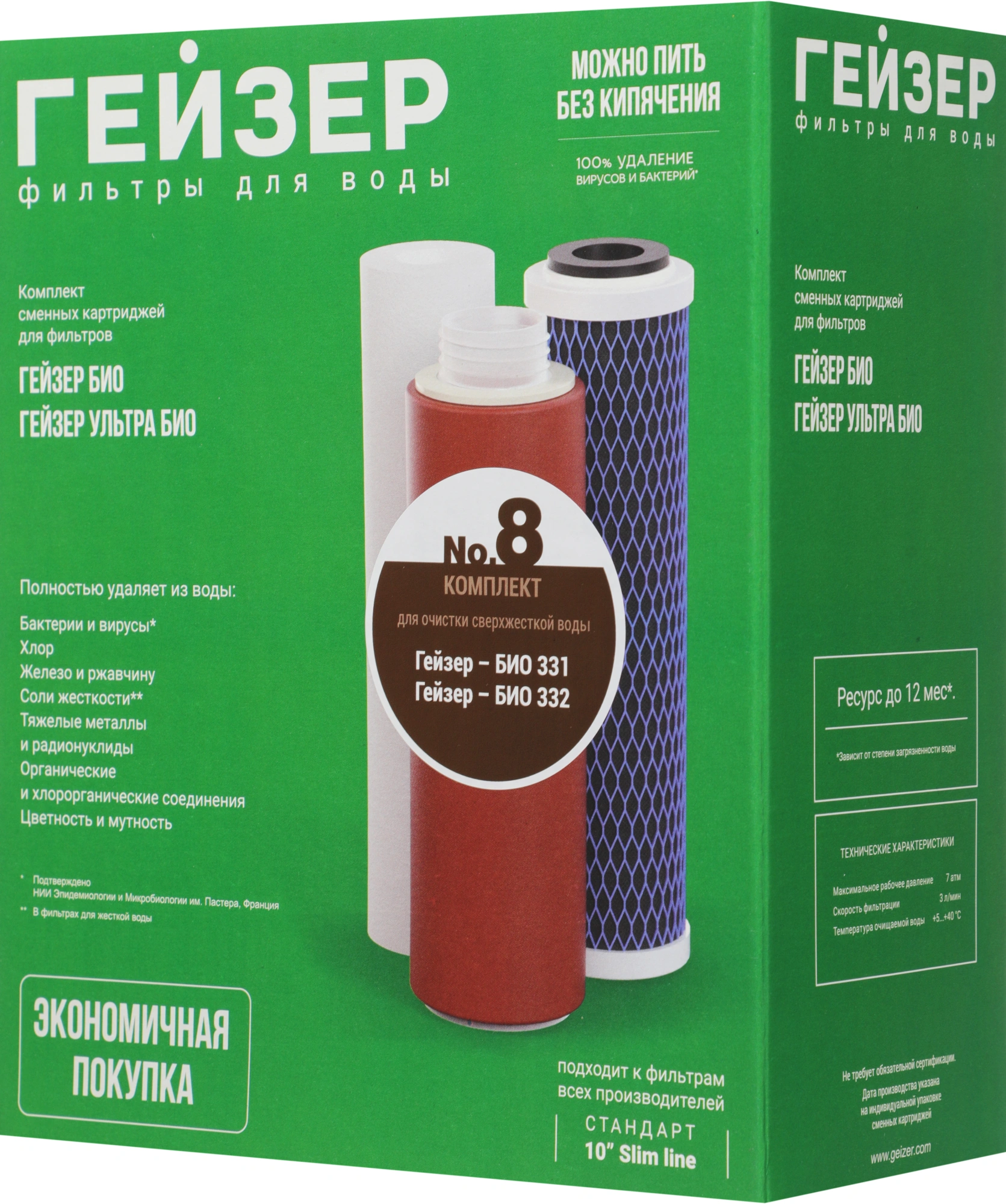 Комплект картриджей Гейзер №8 предназначен для замены исчерпавших свой ресурс картриджей в стационарных трехступенчатых фильтрах для сверхжесткой воды. Признаки сверхжесткой воды: накипь белого цвета в чайнике после первого кипячения, частый белый налет на сантехнике, пленка в чае.