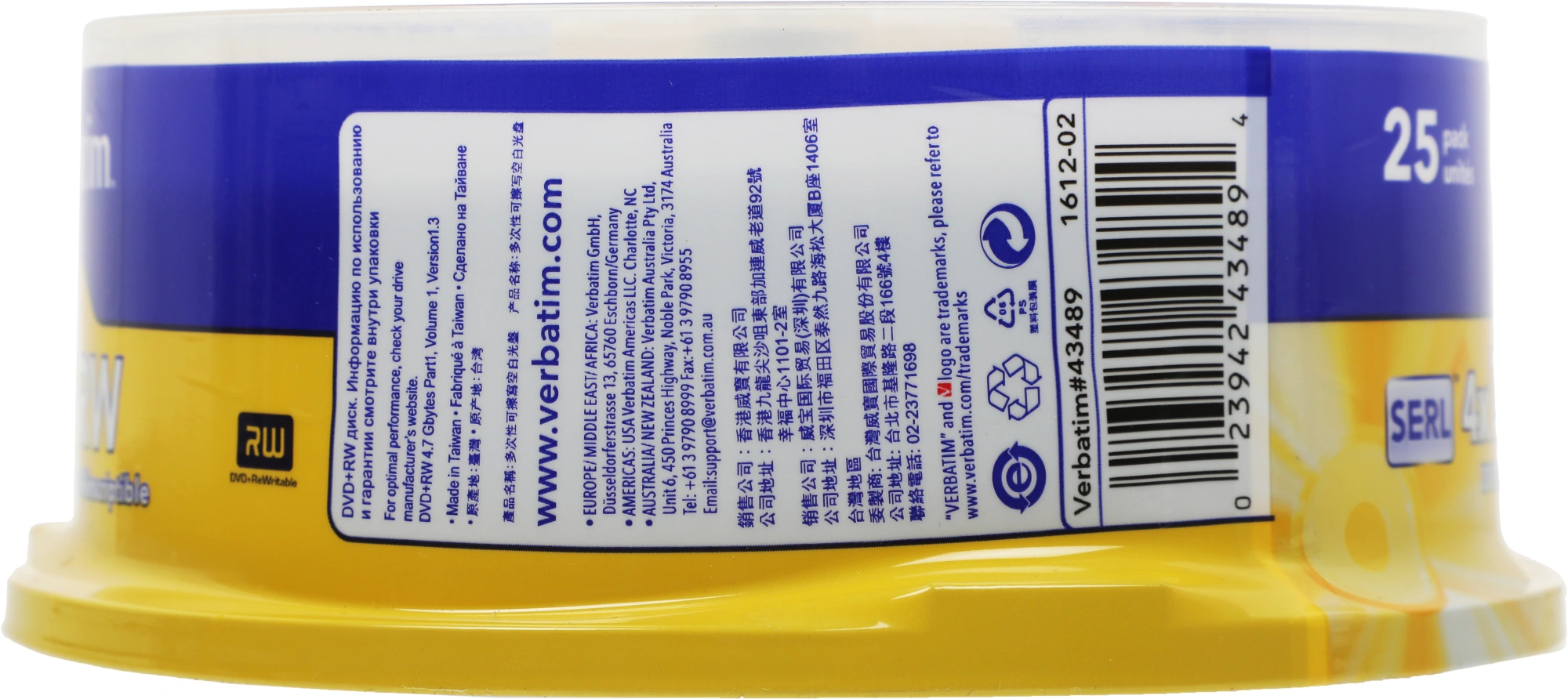Диск DVD+RW Verbatim 4.7Gb 4x Cake Box (25шт) (43489)