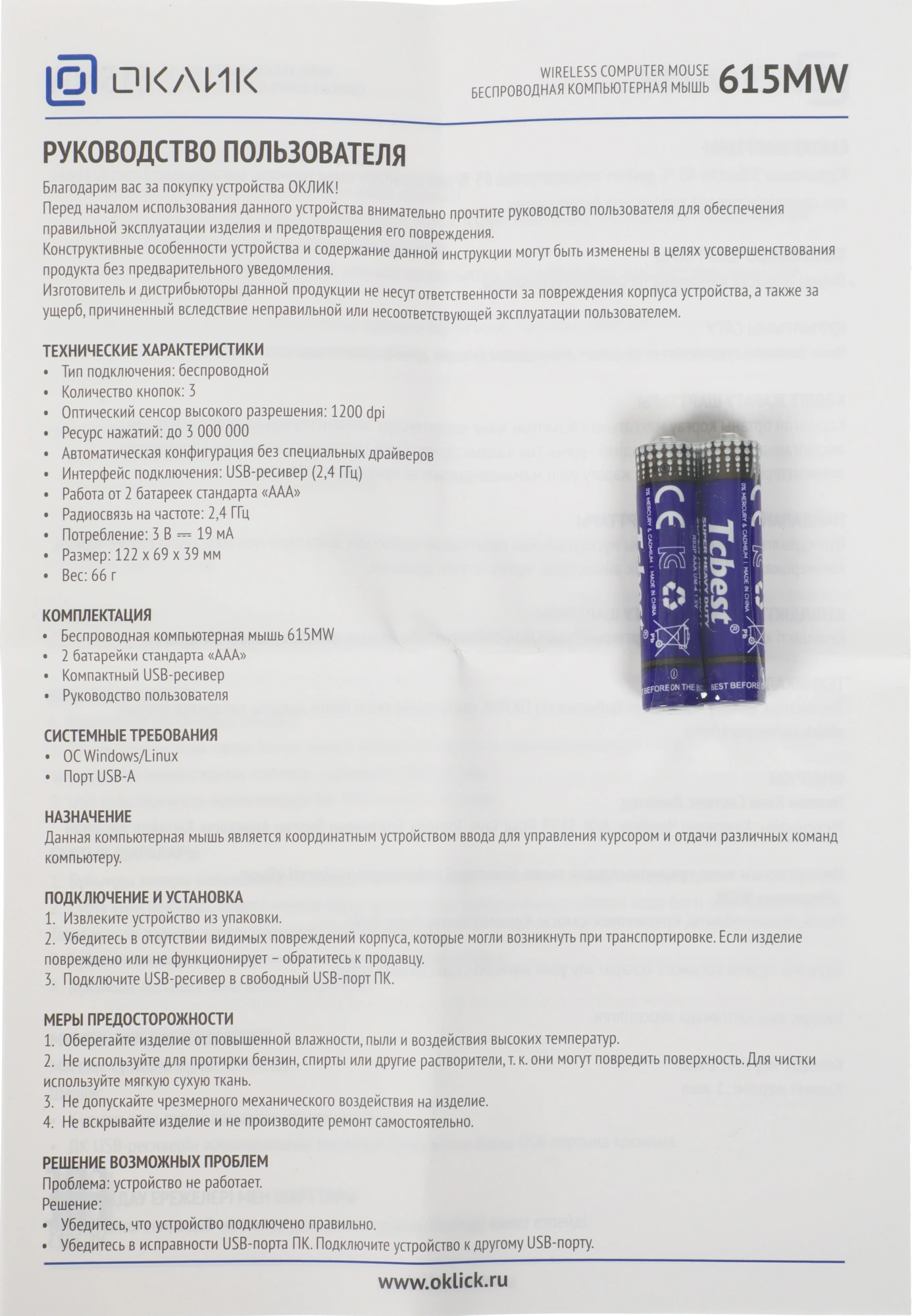 Беспроводная мышь Oklick 615MW с разрешением оптического сенсора 1200 dpi – оптимальный вариант для редактирования текстов, отправки писем, просмотра веб-сайтов и других офисных задач. На корпусе расположены 3 кнопки, их ресурса хватит на 3 млн кликов. Универсальное ПО поможет расширить функциональные возможности устройства, чтобы работать с ним стало еще удобнее.