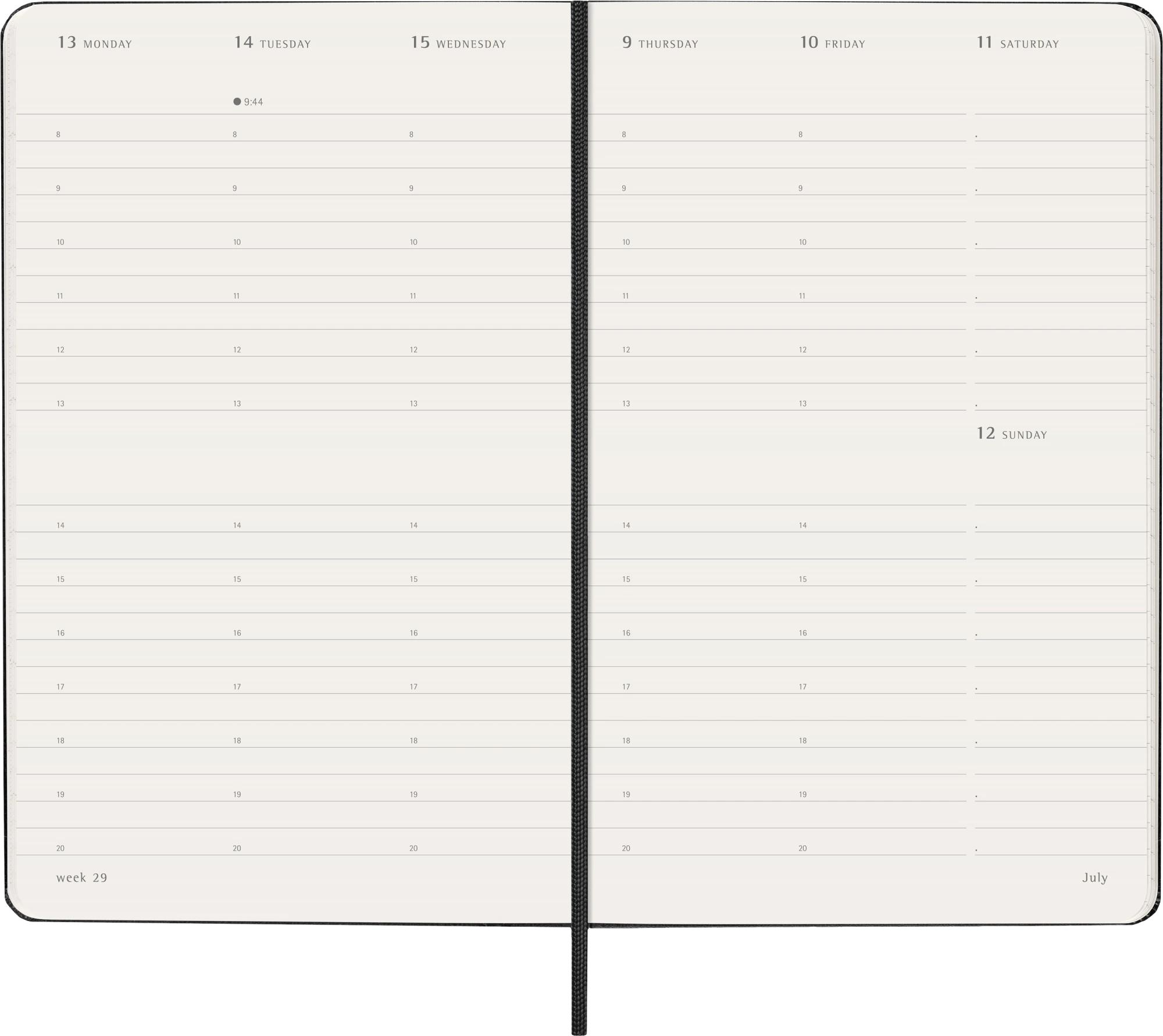 Еженедельник/дневник Moleskine Vertical, имея вертикальный формат расположения элементов, при котором каждая неделя отображается на двухстраничном развороте, а дни недели занимают верхнюю часть разворота, идеально подходит для тех, кто хочет всегда иметь перед собой обзор плана на неделю.
