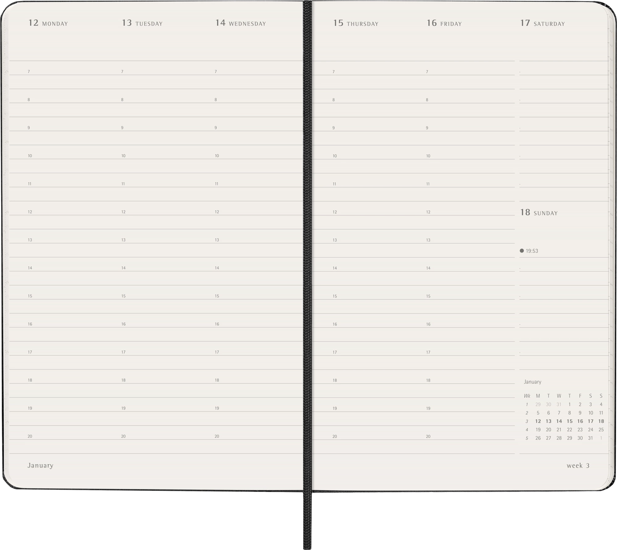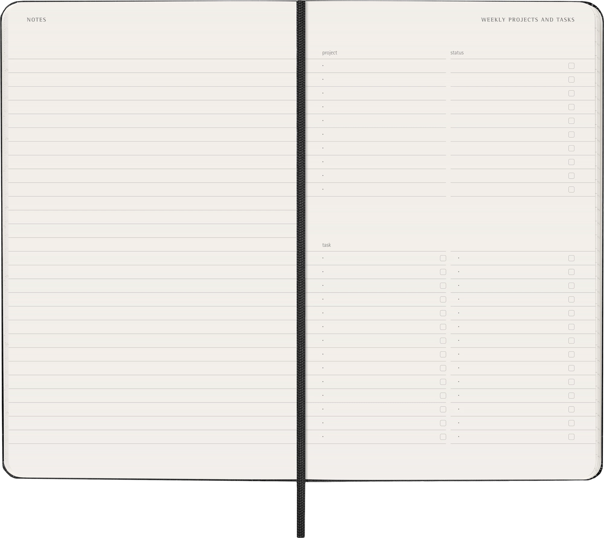 Планировщик задач, в котором для каждой недели отведено четыре страницы: вертикальный двухстраничный разворот для целой недели с миниатюрным изображением двух полных месяцев, за которым следует пара страниц для заметок, разделы «список задач на неделю» и планирования проектов.
