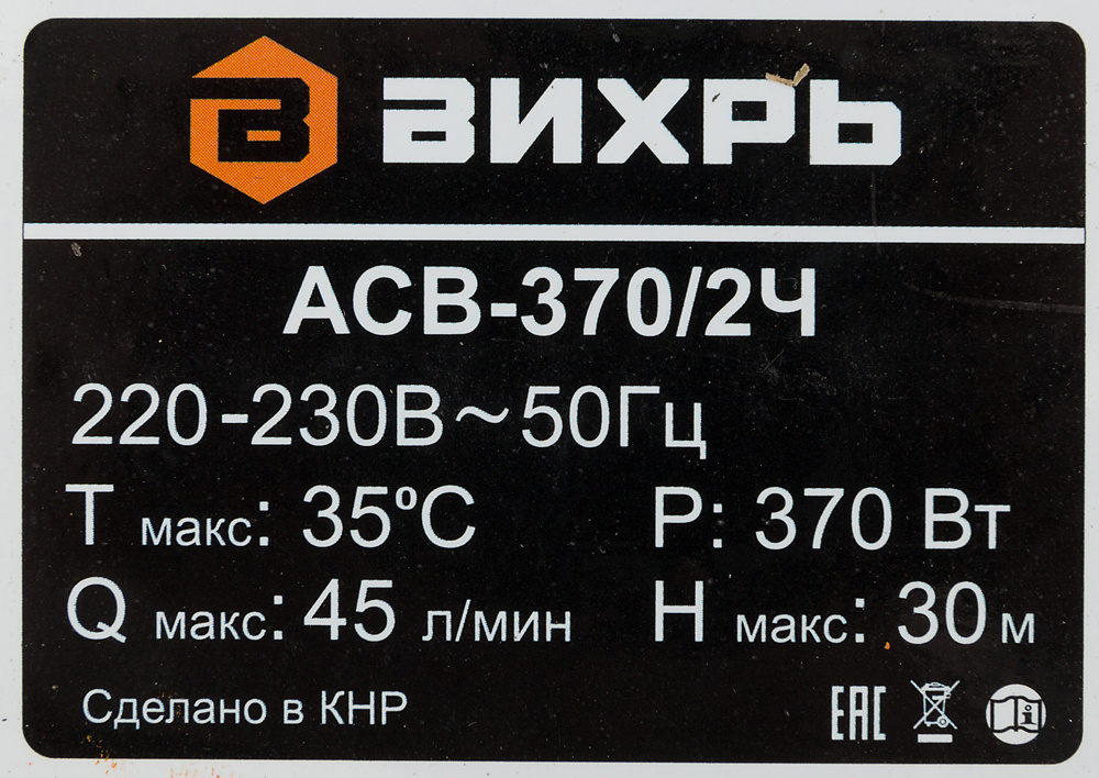 Диаметр входного и выходного патрубка – 1 дюйм, максимальное количество включений в час - 20. Тип электродвигателя - Асинхронный, однофазный с короткозамкнутым ротором.