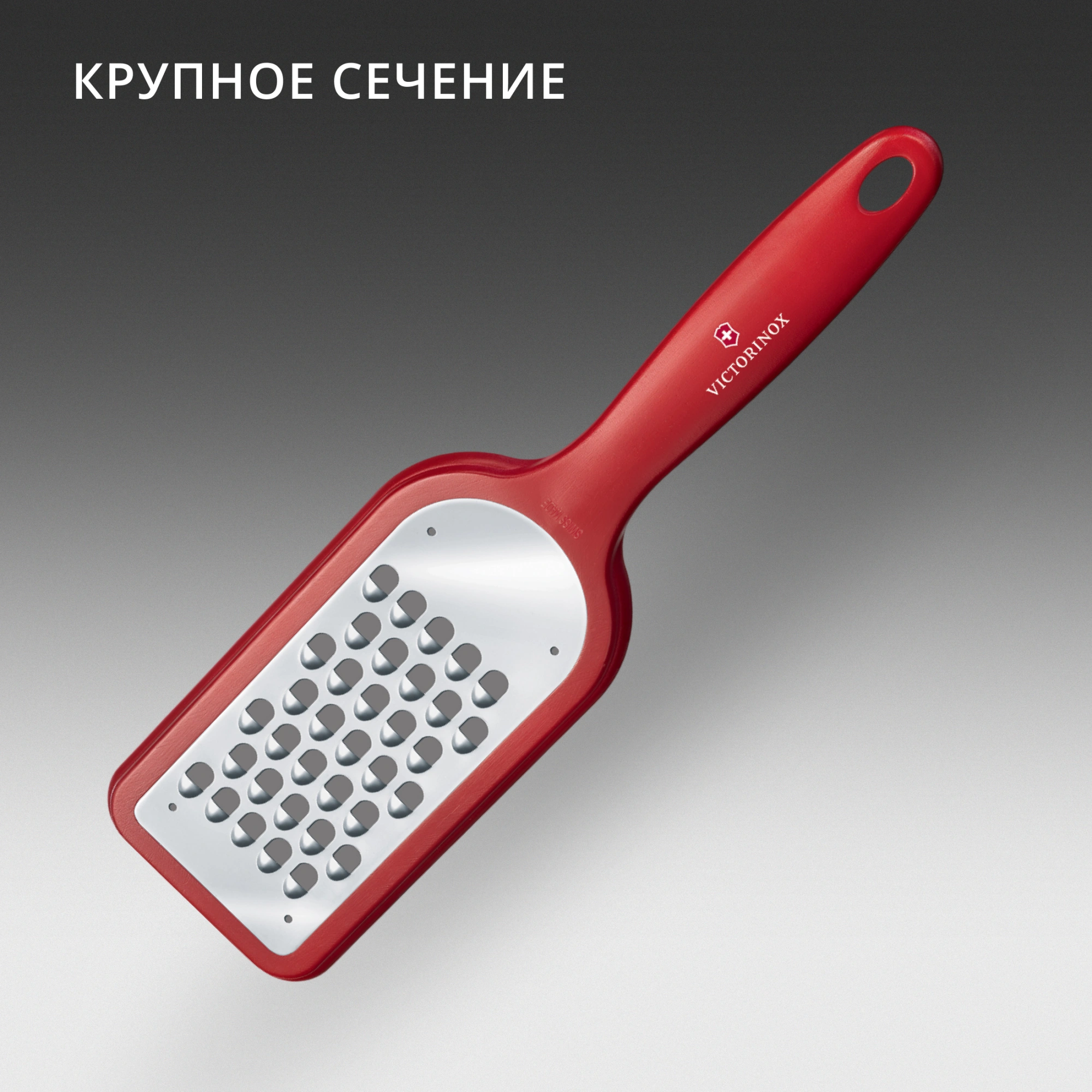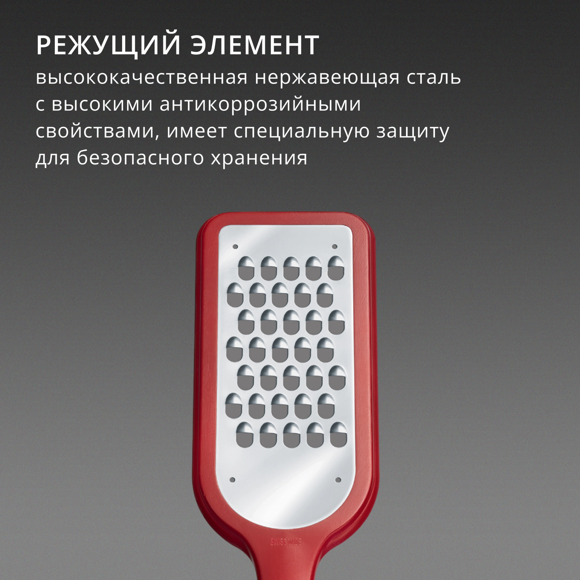 Крупная тёрка идеально подходит для измельчения овощей и фруктов. Противоскользящая рукоять с дополнительными выемками повышает удобство использования тёрки. Модель имеет защиту режущего элемента, что обеспечивает её безопасное хранение. Пригодна для использования в посудомоечной машине.