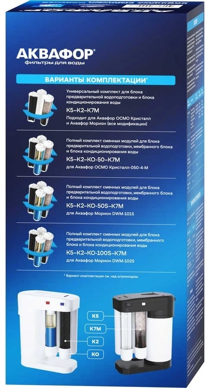 Модуль К5 - предварительная сорбционная очистка питьевой воды (для частиц размером 5 мкм). Модуль К2 - глубокая сорбционная доочистка питьевой воды (для частиц размером 3 мкм). Модуль К7M - финишная сорбционная очистка и кондиционирование питьевой воды (для частиц размером 0,8 мкм).