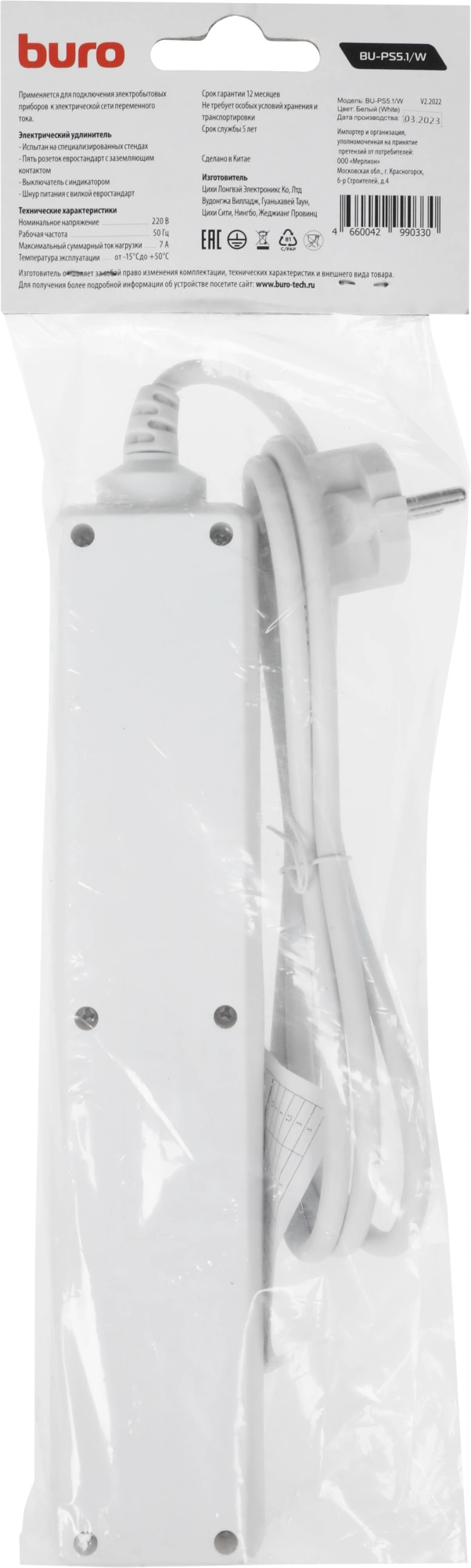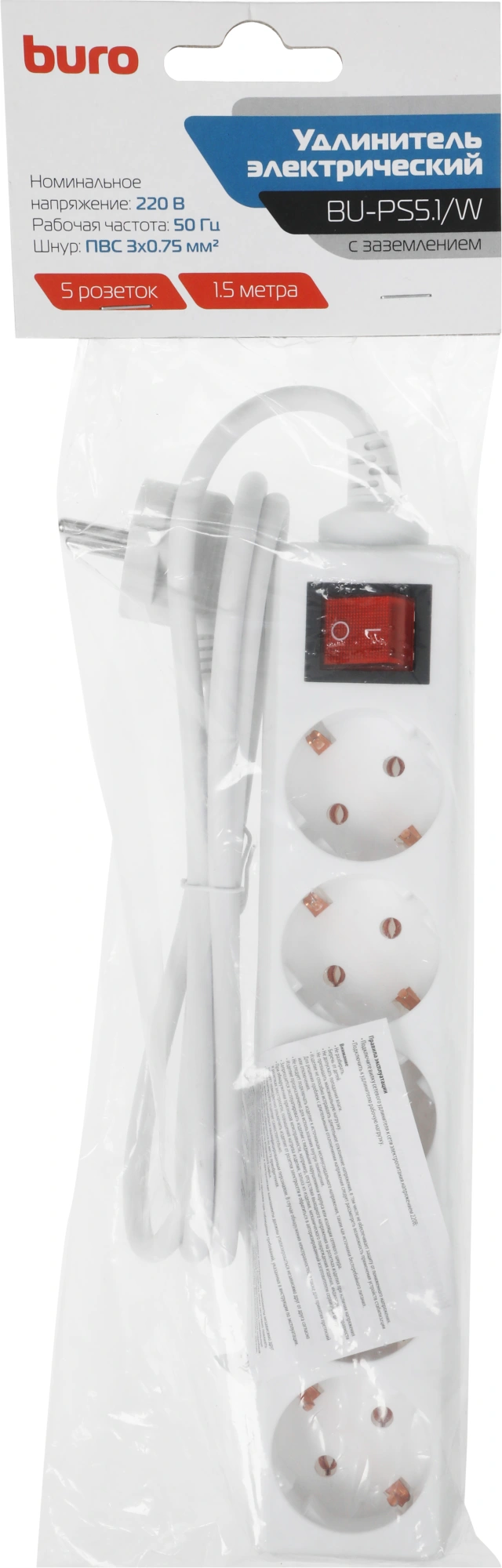 1.5м (5 розеток) белый (пакет ПЭ)