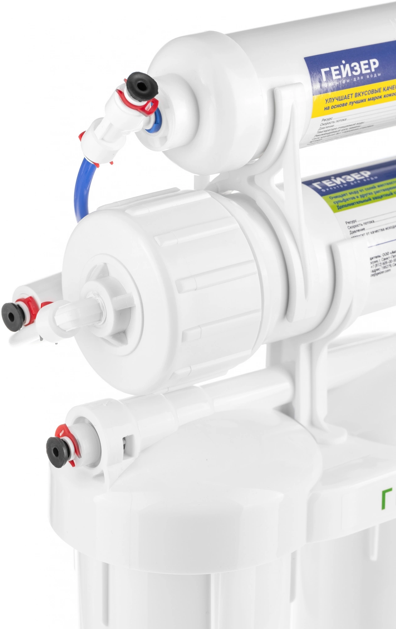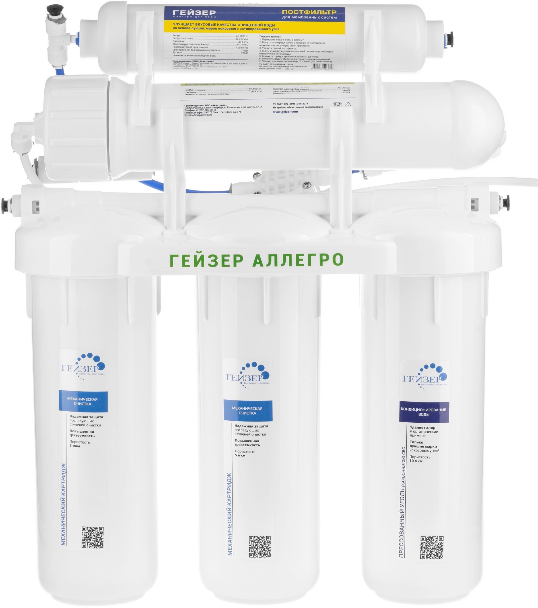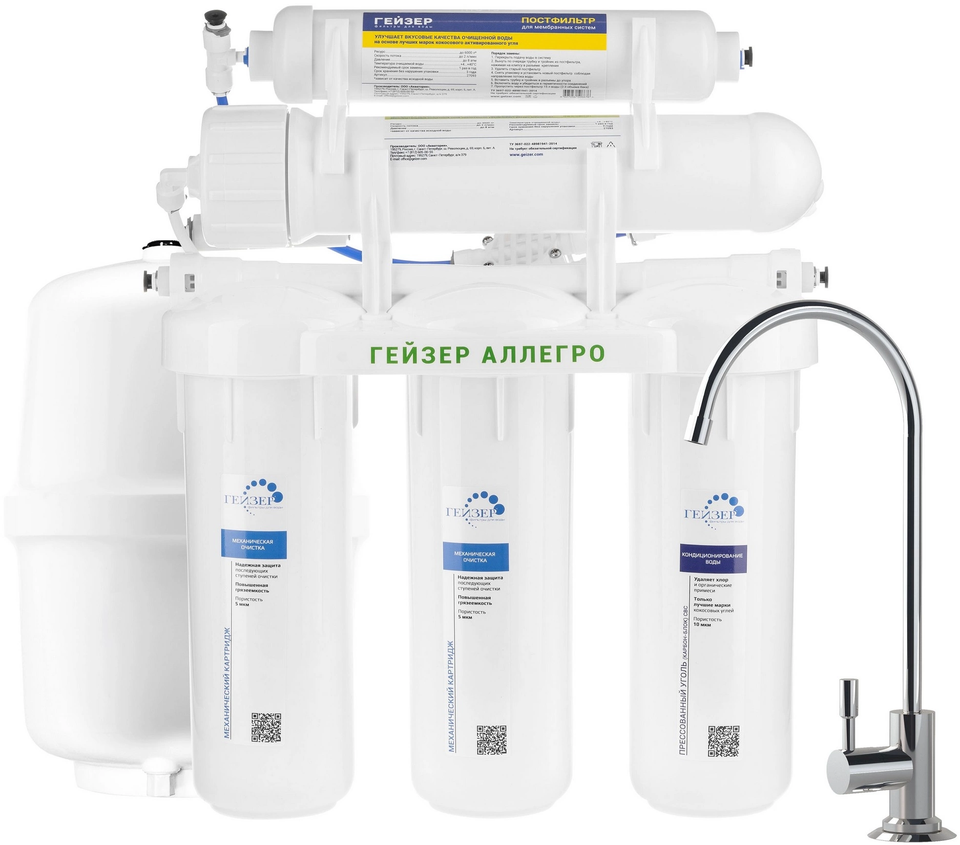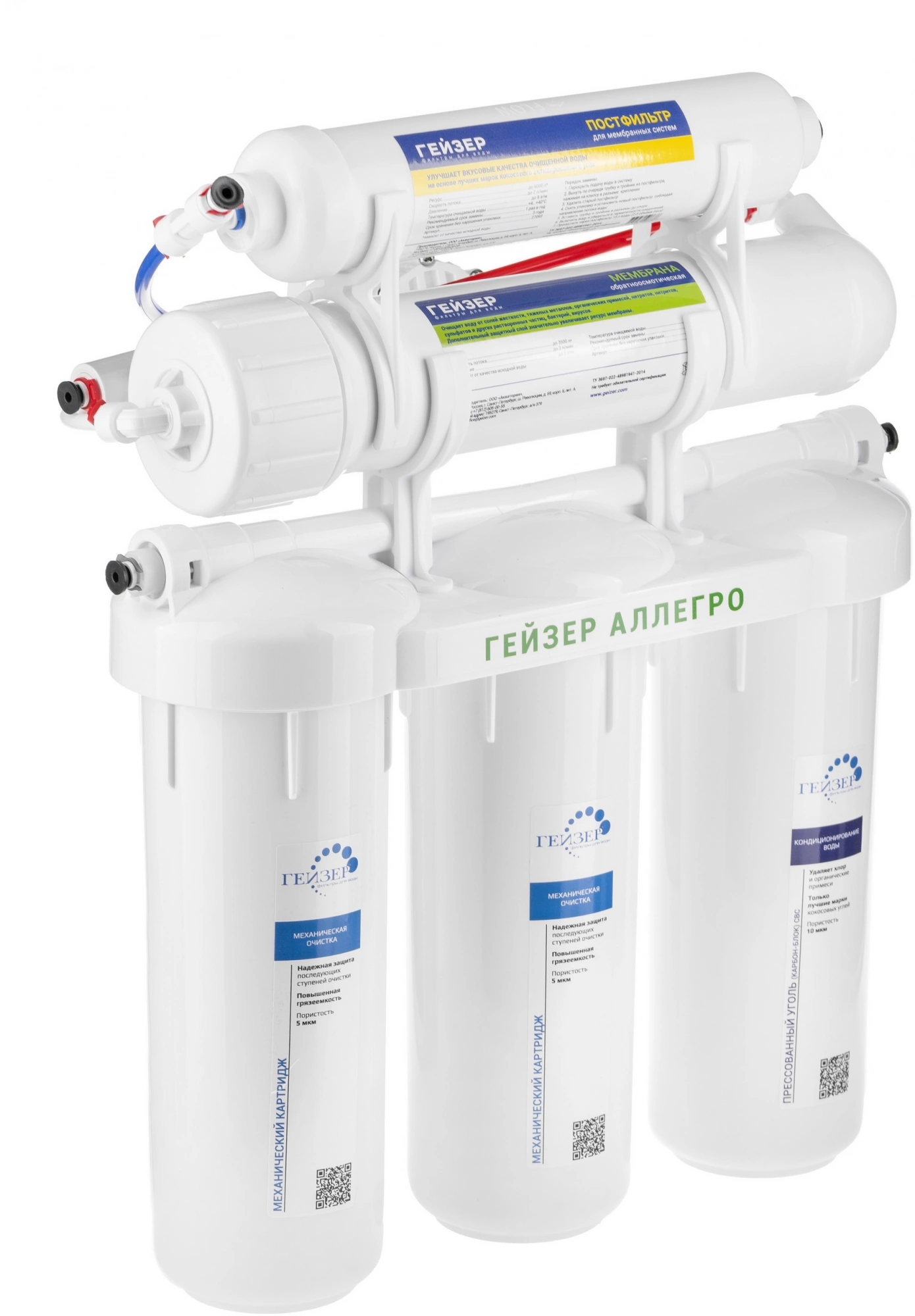 Система обратного осмоса Гейзер Аллегро. Применяется многоступенчатая схема очистки и кондиционирования воды методом обратного осмоса. Выпускается с пластиковым баком. Вода, очищенная фильтром Гейзер Аллегро, близка по своим свойствам к талой воде древних ледников.