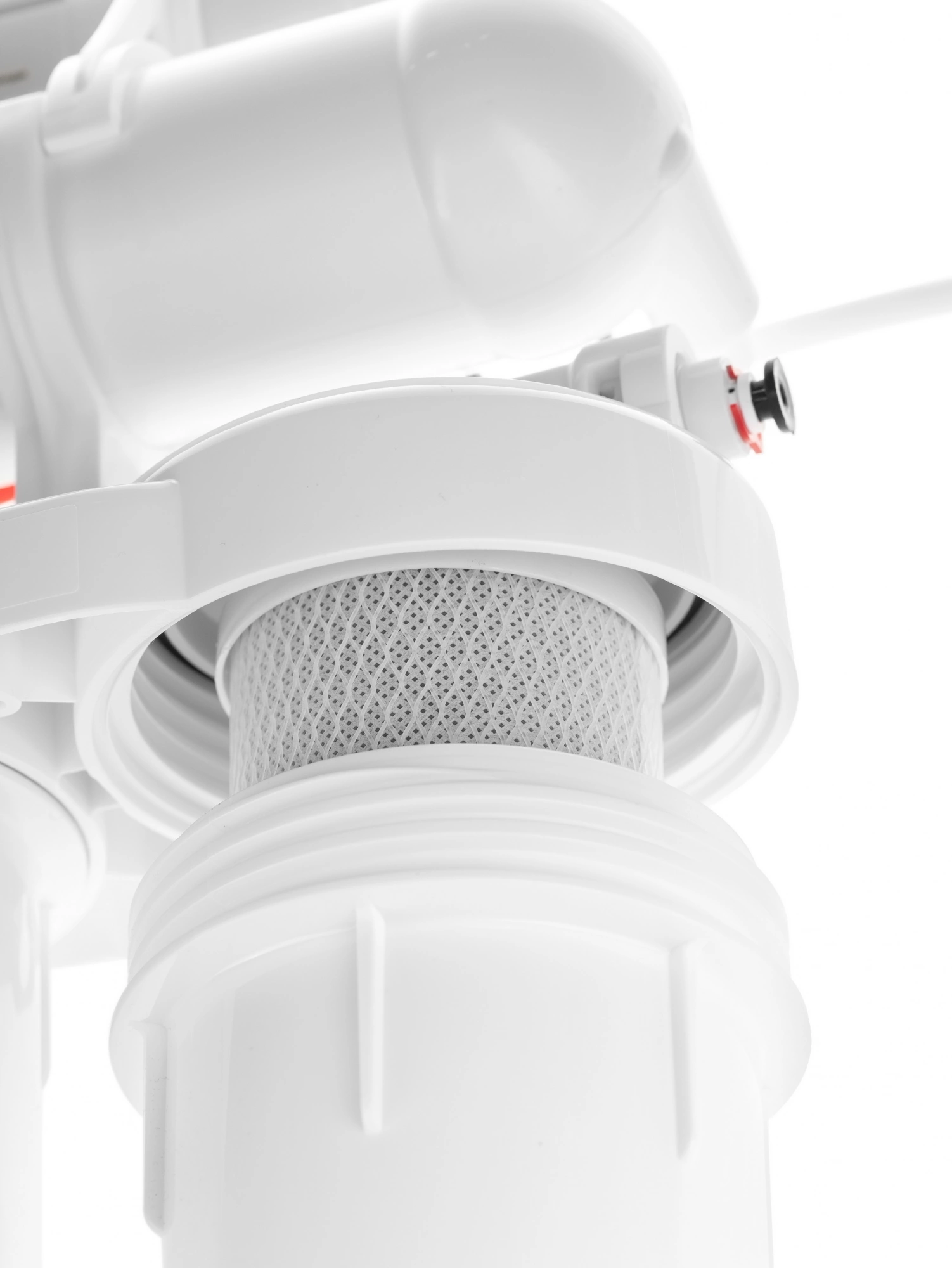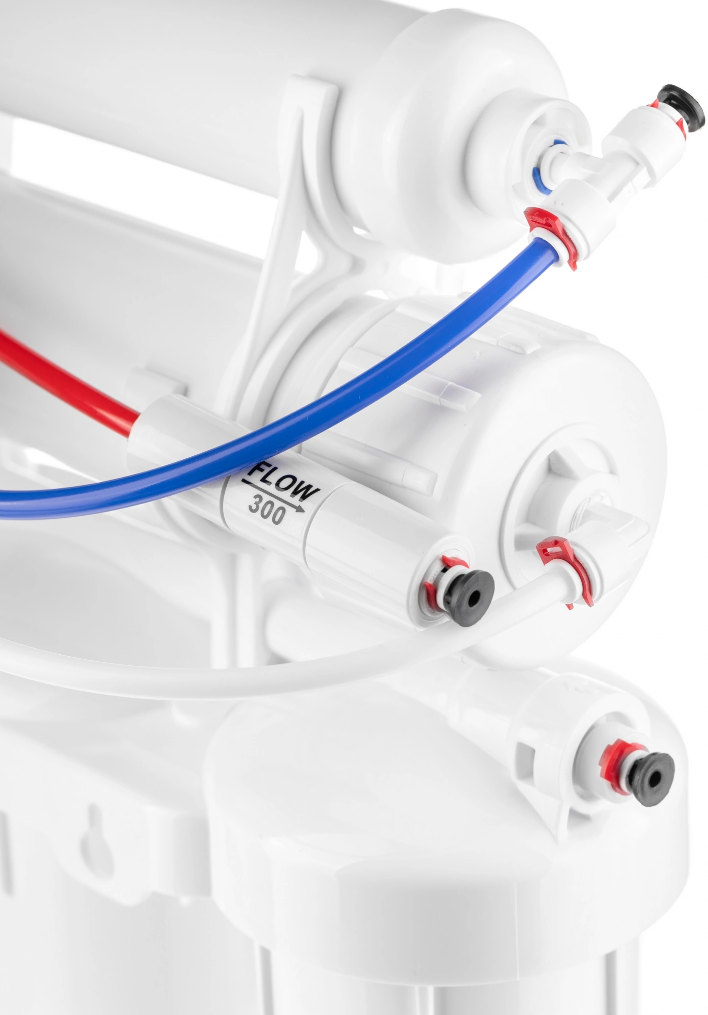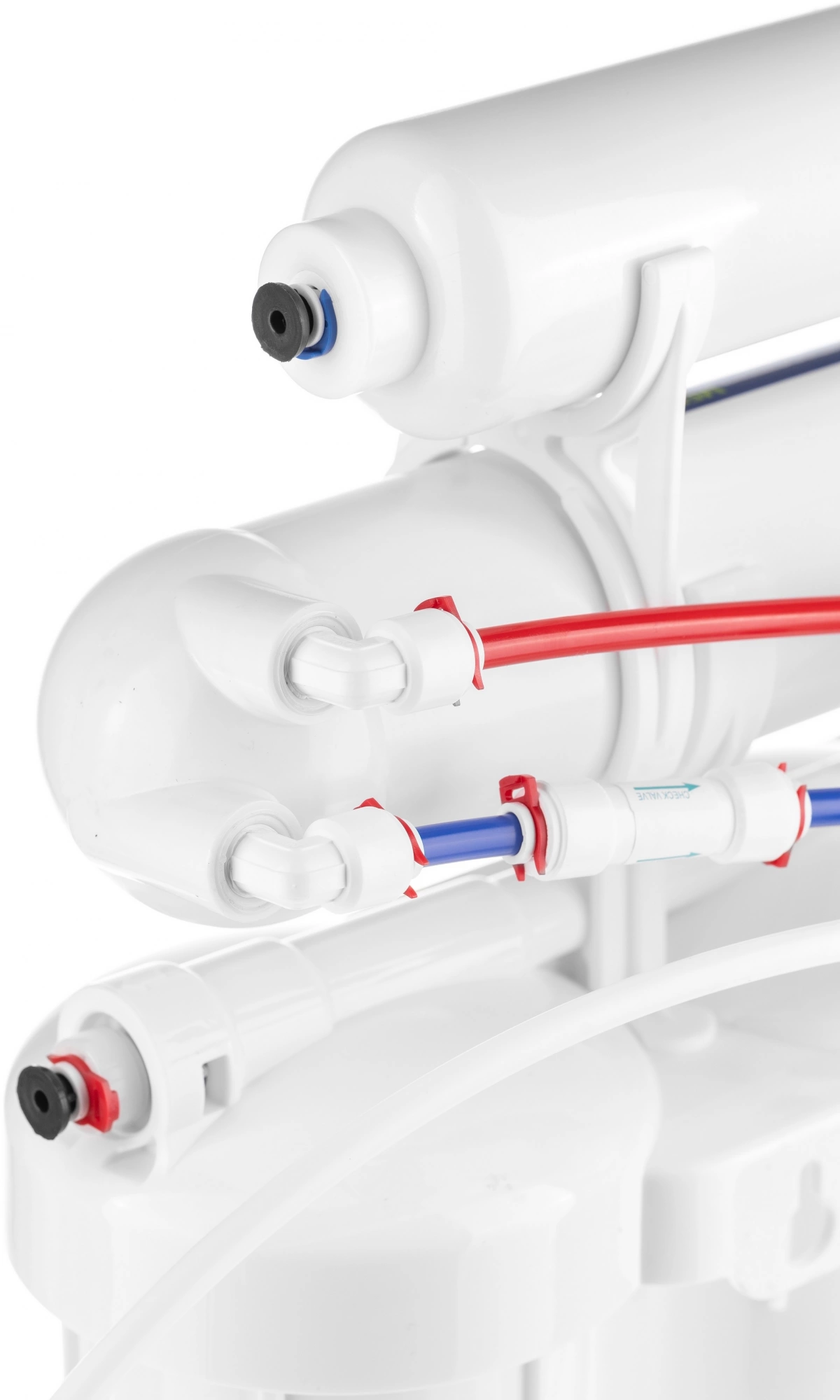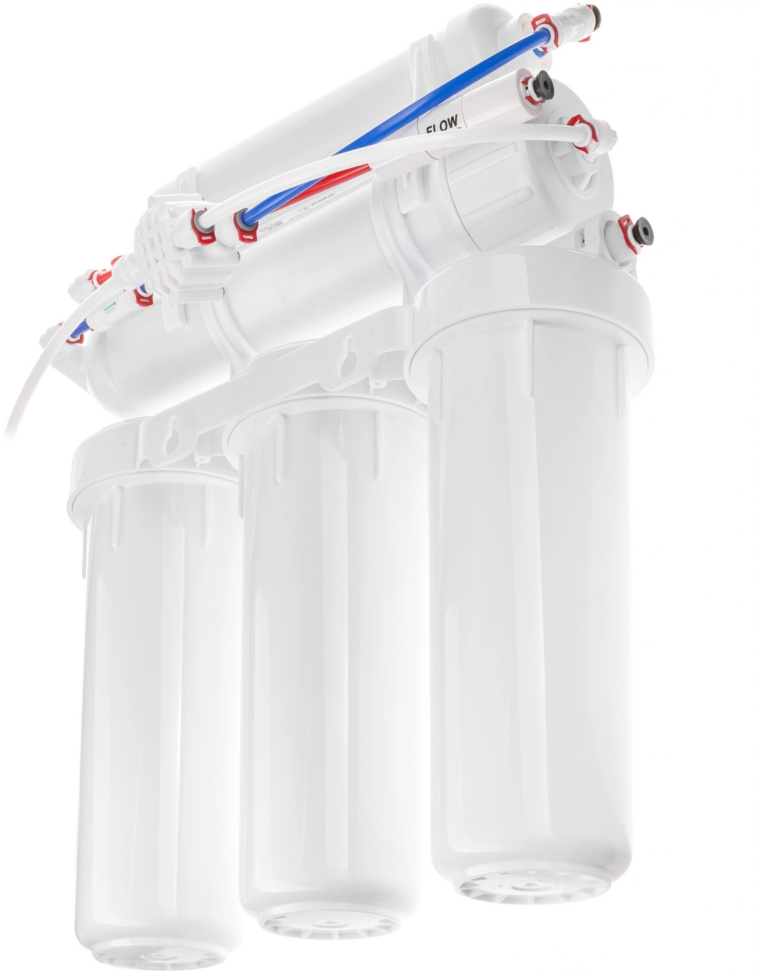 1-я ступень очистки - картридж PP 5 мкр. Ресурс 20000 литров. 2-я - картридж PP 5 мкр. Ресурс 20000 литров. 3-я - картридж СВС. Ресурс 7000 литров. 4-я - обратноосмотическая мембрана 50 галлон. Ресурс 1,5 - 2 года. 5-я - угольный посфильтр. Ресурс 1 год.