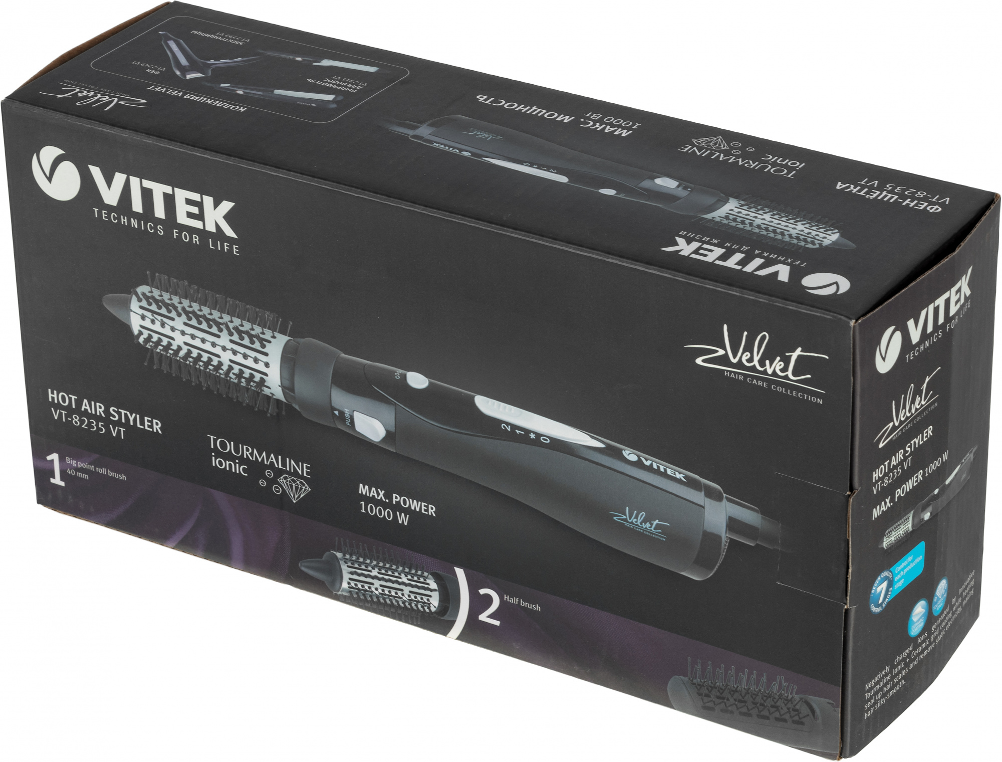 Фен-щетка VITEK VT-8235 VT имеет 2 режима температуры и подачи воздуха, 2 насадки в комплекте. Вы с легкостью настроите подходящие параметры и сделаете укладку.