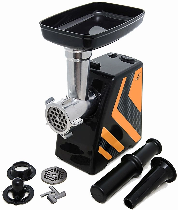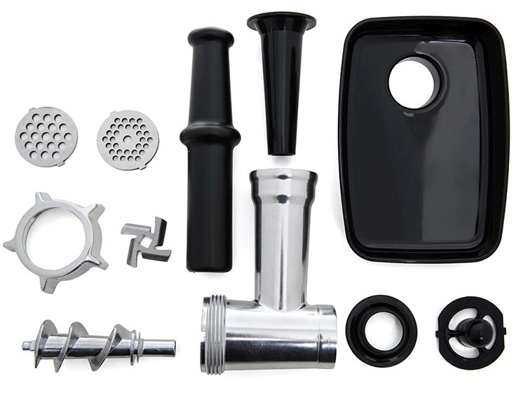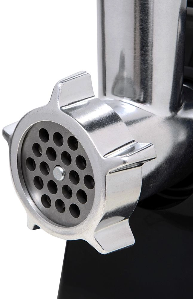 В комплект входят решетки для изготовления фарша с отверстиями 5 и 7 мм, а также специальные насадки для колбас и кеббе.