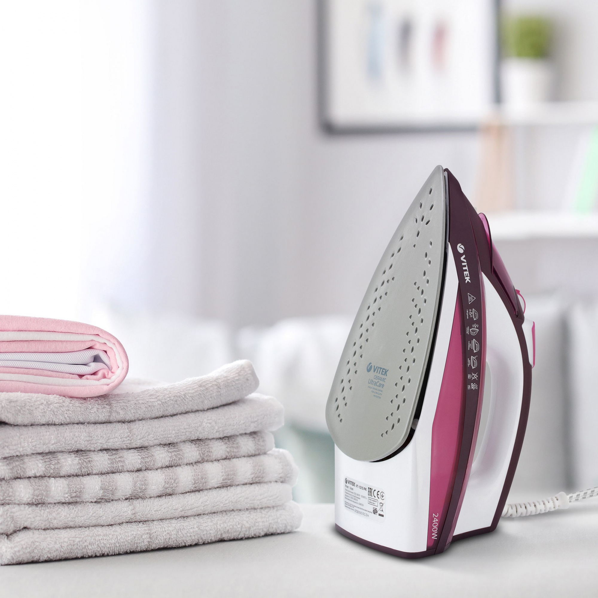 Стильный современный утюг VITEK VT-1215 с максимальной мощностью 2400 Вт позволит вам быстро и качественно отгладить платье, рубашку или костюм. Подошва прибора имеет уникальное керамическое покрытие UniCera, устойчивое к сколам и царапинам, которое обеспечивает сверхлегкое скольжение по ткани. Вы можете выбрать сухое глажение, а также воспользоваться функцией разбрызгивания или удобной системой вертикального отпаривания (паровой удар — до 140 г/мин). Объем резервуара для воды — 320 мл. Утюг абсолютно безопасен в эксплуатации, так как отключается автоматически, если оставить его без движения. Наличие функции «антикапля», системы самоочистки и встроенной защиты от накипи гарантирует особый комфорт в использовании устройства. Купить утюг VITEK VT-1215 можно не только для себя, но и в подарок близким людям: они по достоинству оценят и внешний вид прибора, и его рабочие качества.