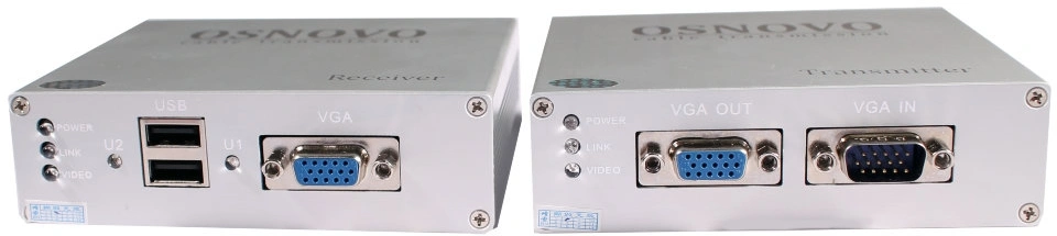 Разъемы: RJ-45 (для подключения приемника к передатчику), 2 х USB (для подключения клавиатуры и мыши), 15-Pin (VGA). Используется с устройствами на базе ОС Windows, с DVR Standalone на базе OC Linux; БП DC9V/1A- 2 шт (в комплекте); передатчик-130х100х30 мм, приемник -130х100х30 мм. 0... +55 С.