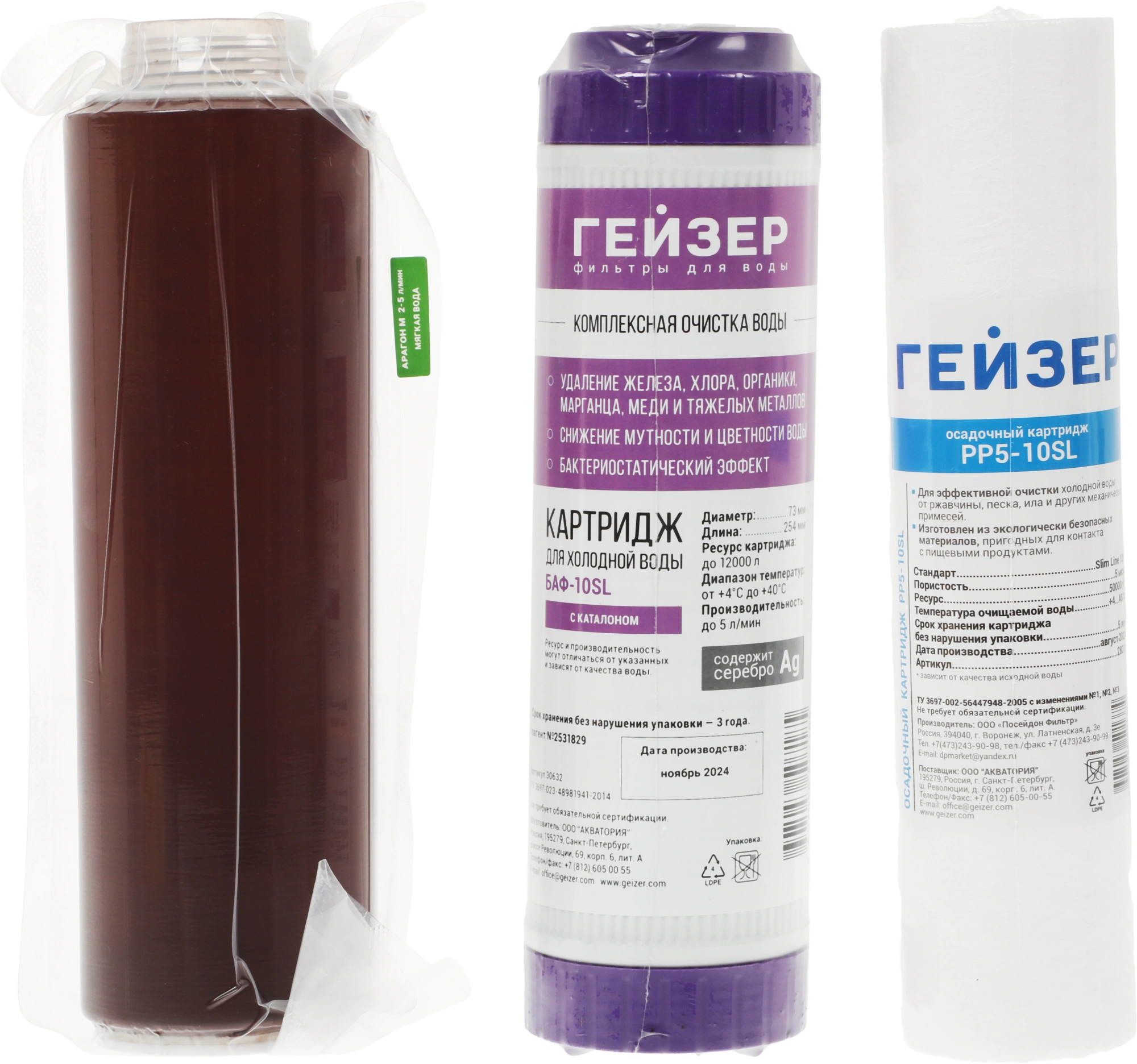 Состав комплекта К-2: 1-я ступень (картридж PP 5 мкр.). Ресурс 10000 литров. 2-я ступень (картридж Арагон М). Ресурс 7000 литров. 3-я ступень (картридж БАФ). Ресурс 12000 литров.