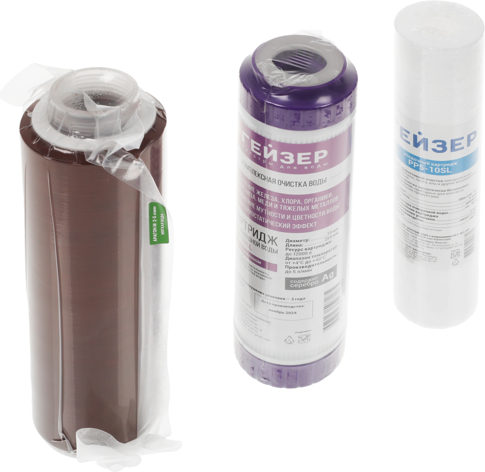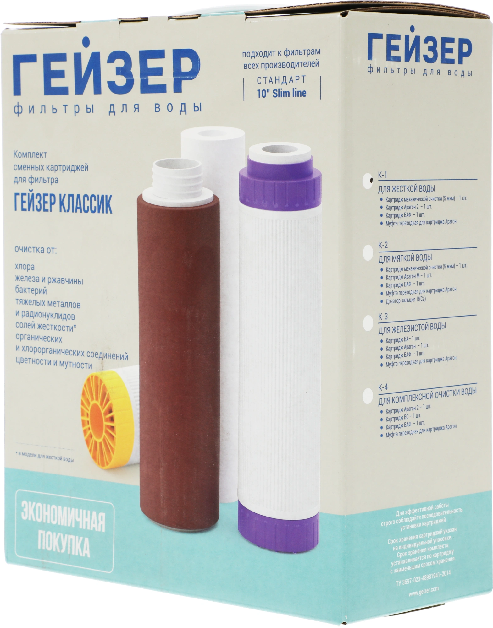 Комплект картриджей Гейзер К-2 предназначен для замены исчерпавших свой ресурс картриджей в стационарных трехступенчатых фильтрах для мягкой воды.