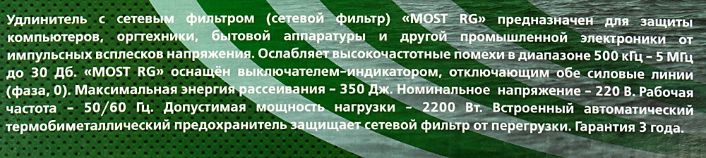 Сетевой фильтр Most RG - отличная, недорогая модель с хорошими характеристиками. Предназначен для защиты компьютерной техники, аудио-видео аппаратуры от импульсных перенапряжений и высокочастотных помех дома и в офисе. Рекомендуется для использования в сетях с относительно стабильным напряжением.