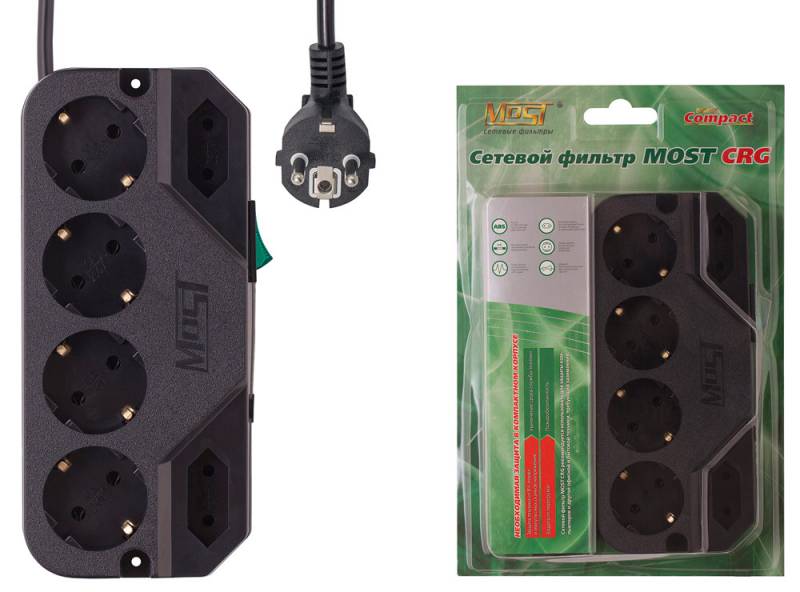 Most СRG - компактный сетевой фильтр для дома и офиса. Предназначен для защиты компьютерной техники, аудио- и видеоаппаратуры от импульсных всплесков напряжения и высокочастотных помех.
