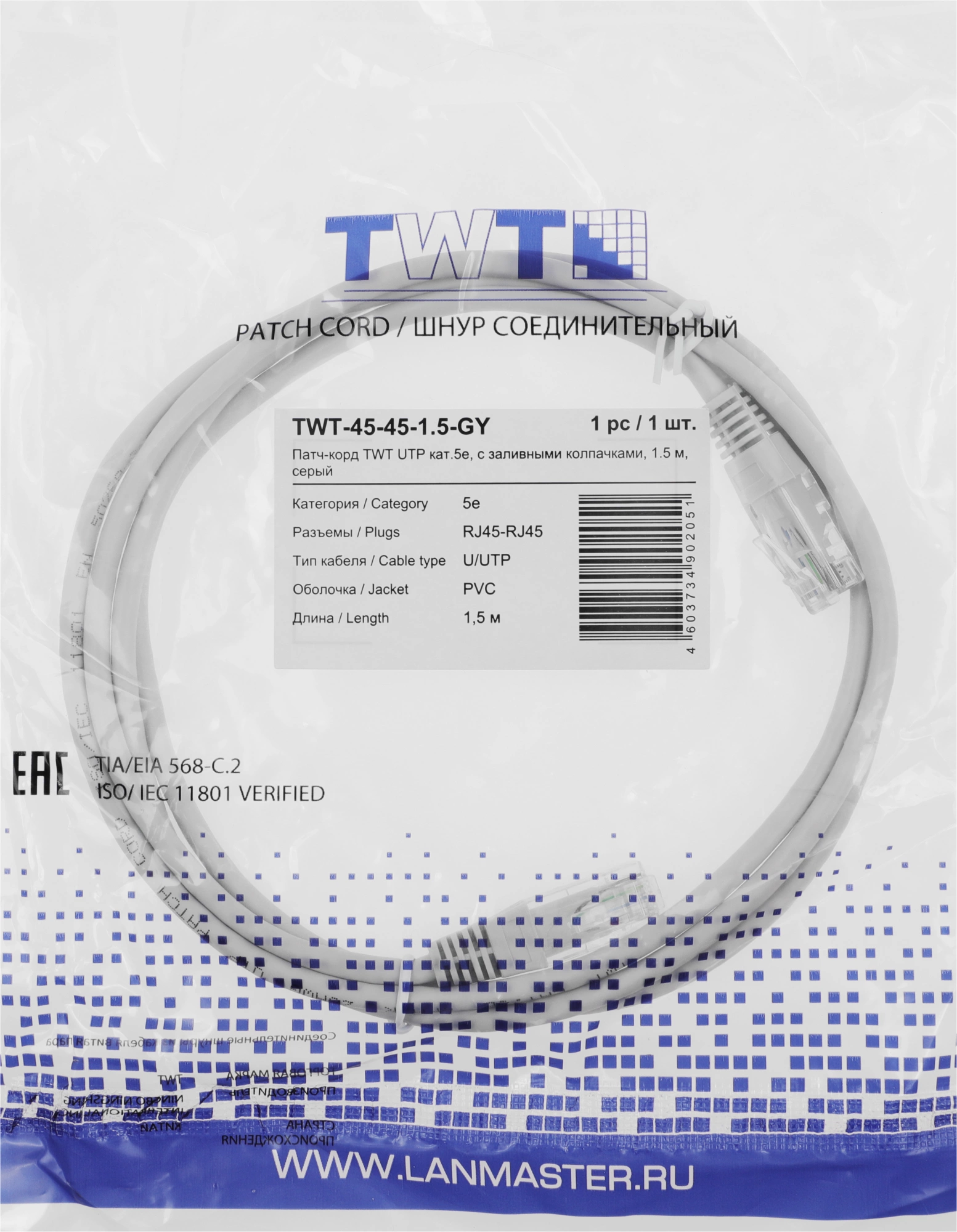 Патч-корд Lanmaster TWT-45-45-1.5-GY UTP RJ-45 вил.-вилка RJ-45 кат.5E 1.5м серый ПВХ (уп.:1шт)