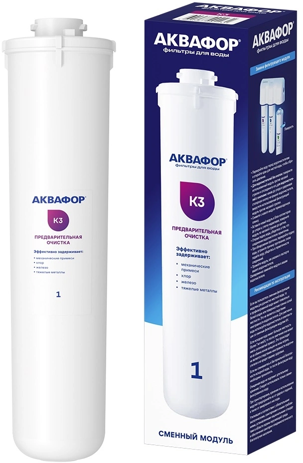 Первый модуль К3 рассчитан на предварительную очистку воды (снижает содержание активного хлора, тяжелых металлов и органических веществ; благодаря высокой гидрофильности материала и лабиринтной структуре пор эффективно фильтрует нерастворимые примеси размером до 10 микрон, в том числе гидроокись железа).