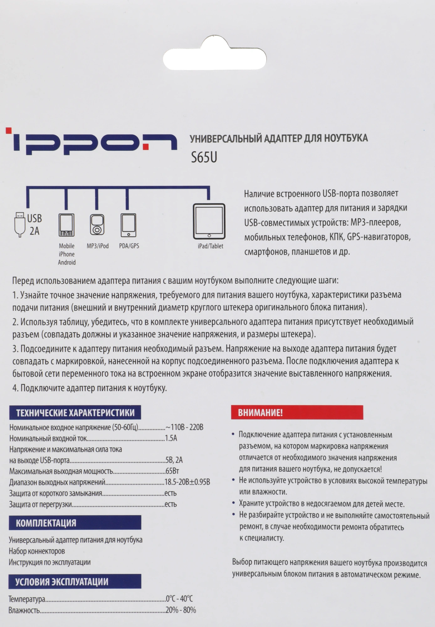Тонкий корпус адаптера Ippon S65U предлагает дополнительное удобство и экономит место при транспортировке. Система охлаждения и встроенная защита от перегрузки, перенапряжения, перегрева и короткого замыкания гарантируют надежное и качественное питание для мобильного компьютера.