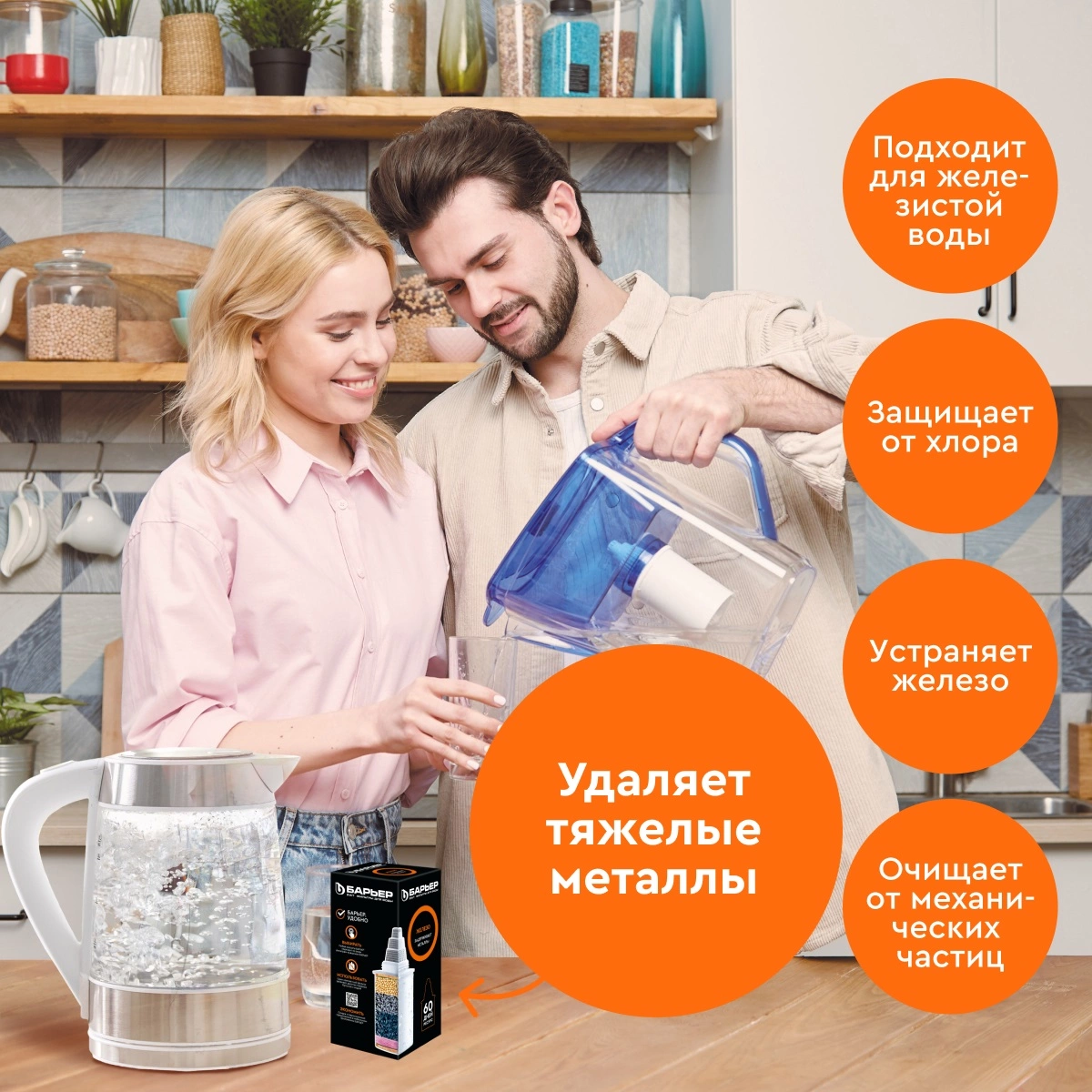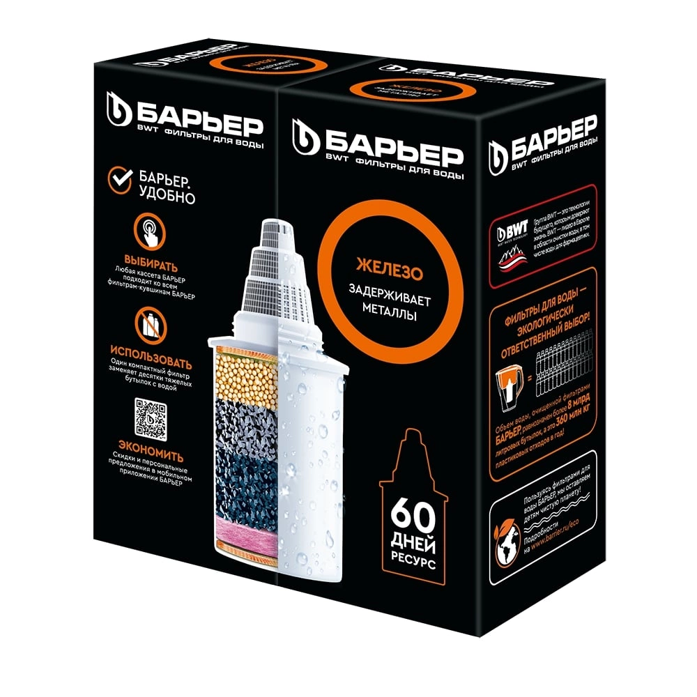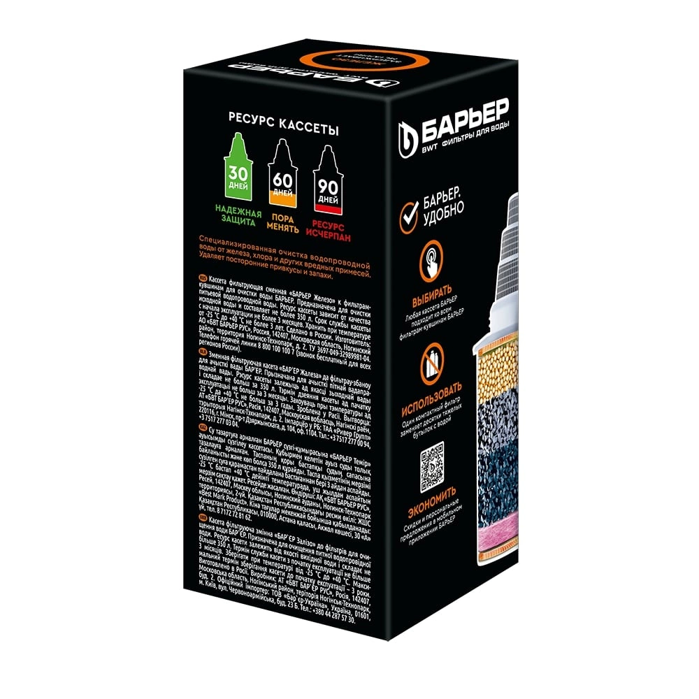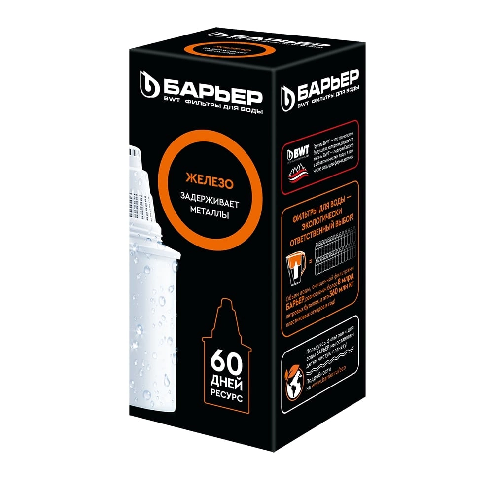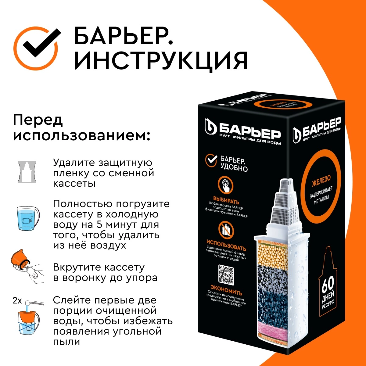 Уникальная кассета для очистки водопроводной воды с избыточным содержанием неорганического железа. Очищает от: хлора и хлорорганических веществ, неорганического железа, тяжелых металлов, АПАВ, фенола. Подходит для всех фильтров-кувшинов БАРЬЕР.