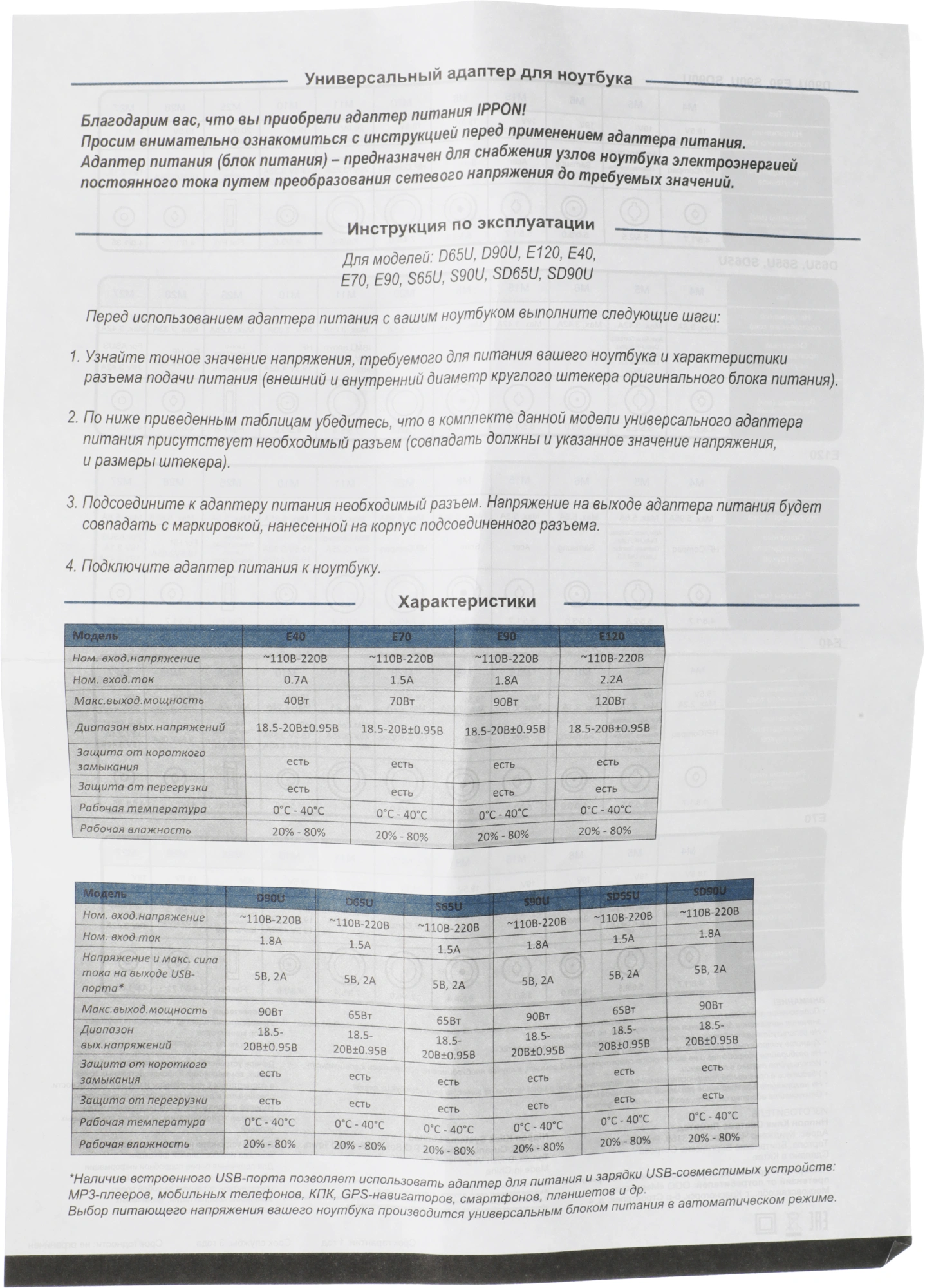Универсальный сетевой адаптер для ноутбуков основных производителей со встроенным USB-портом, через который Вы сможете подзаряжать смартфон, планшет, навигатор или MP3-плеер. Автоматический выбор выходного напряжения, с помощью подключения необходимого переходника. Защита от перегрузки и перегрева.