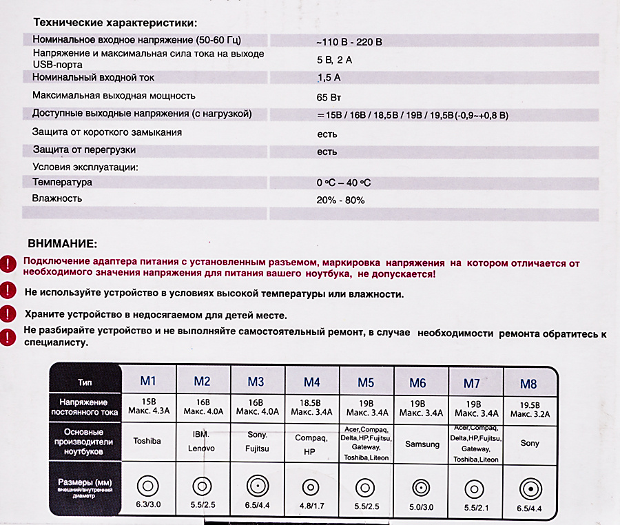 Универсальный сетевой адаптер для ноутбуков основных производителей со встроенным USB-портом, через который Вы сможете подзаряжать смартфон, планшет, навигатор или MP3-плеер. Автоматический выбор выходного напряжения, с помощью подключения необходимого переходника. Защита от перегрузки и перегрева.