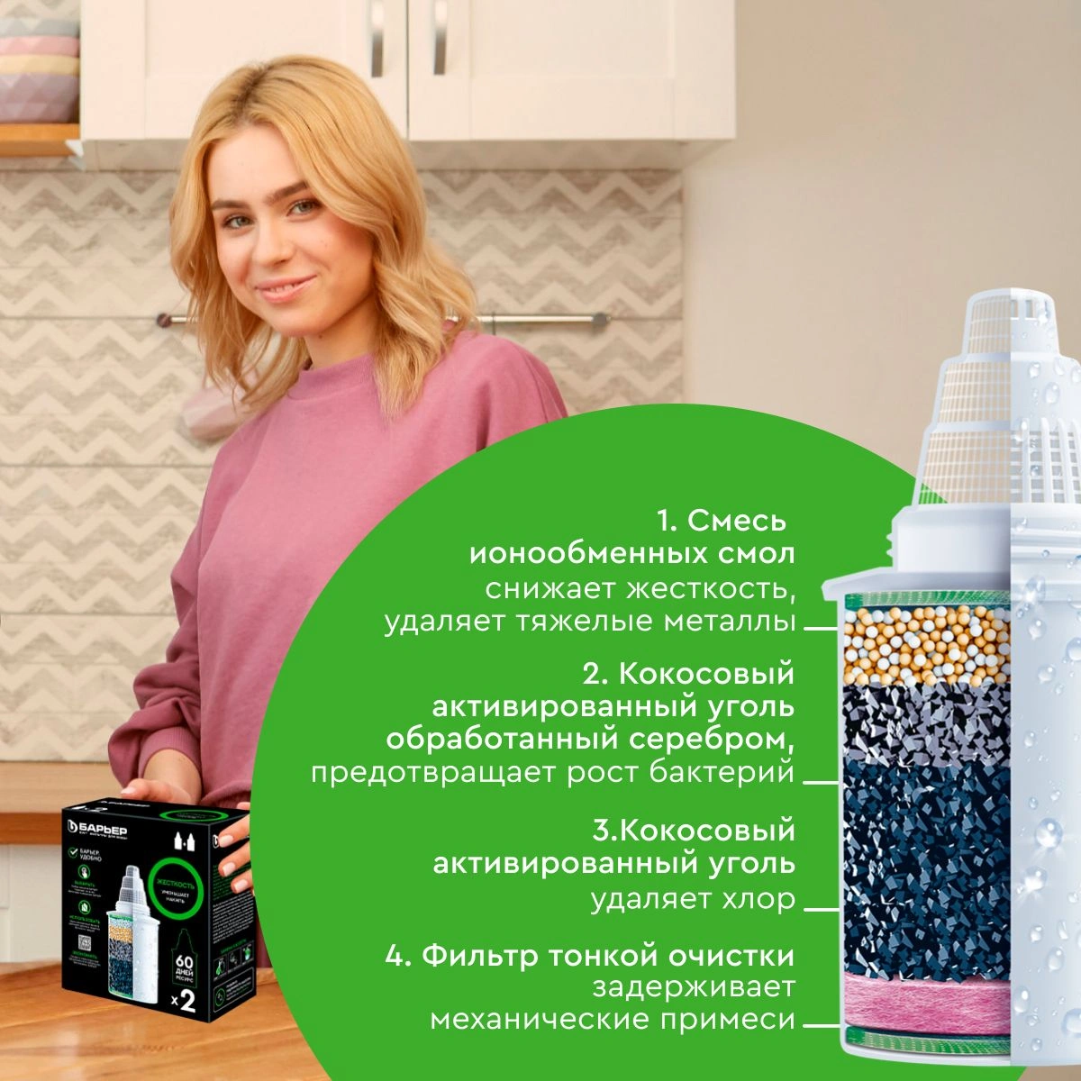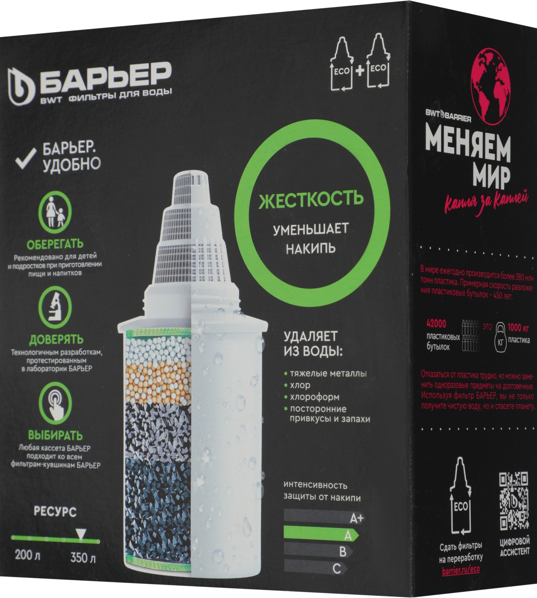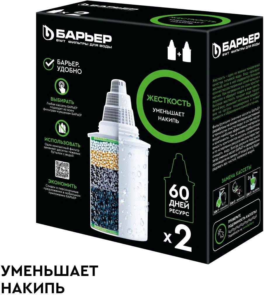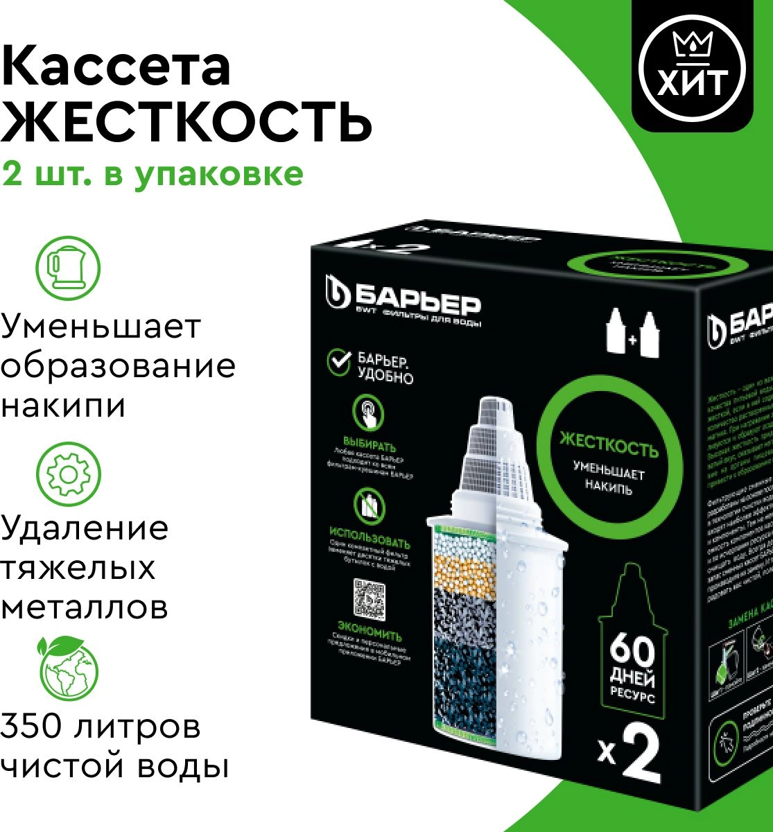 Специальная кассета для водопроводной воды с избыточным количеством солей жесткости. Очищает от: растворенных солей кальция и магния (накипь), хлора и хлорорганических соединений, пестицидов, аПАВ, нефтепродуктов, железа. Подходит для всех фильтров-кувшинов БАРЬЕР.