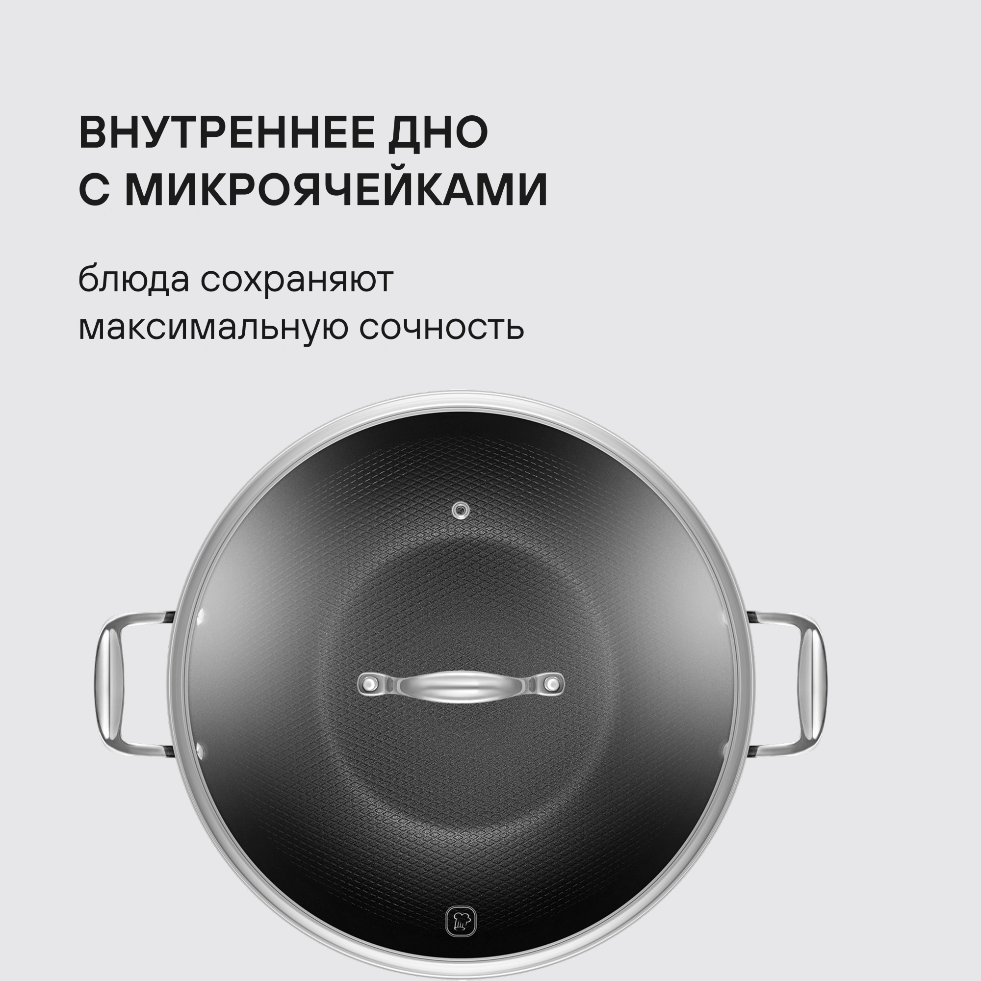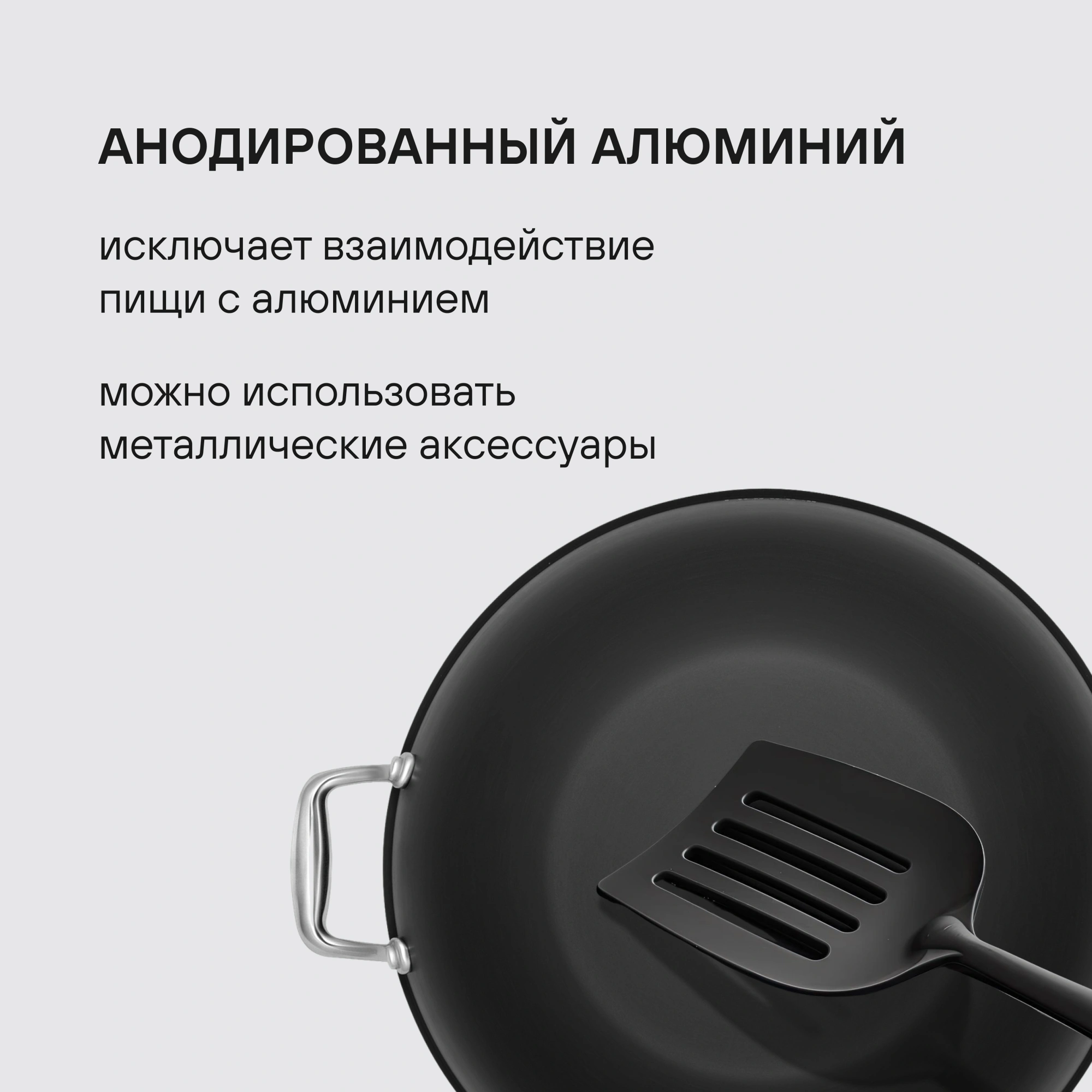 Технология: двустороннее анодирование - 39-44 мкн, исключает взаимодействие пищи с алюминием. Аксессуары: литые, из нержавеющей стали. Преимущества: возможно использование металлических лопаток; Внутреннее дно с микроячейками - блюда сохраняют максимальную сочность. Упаковка: подарочная