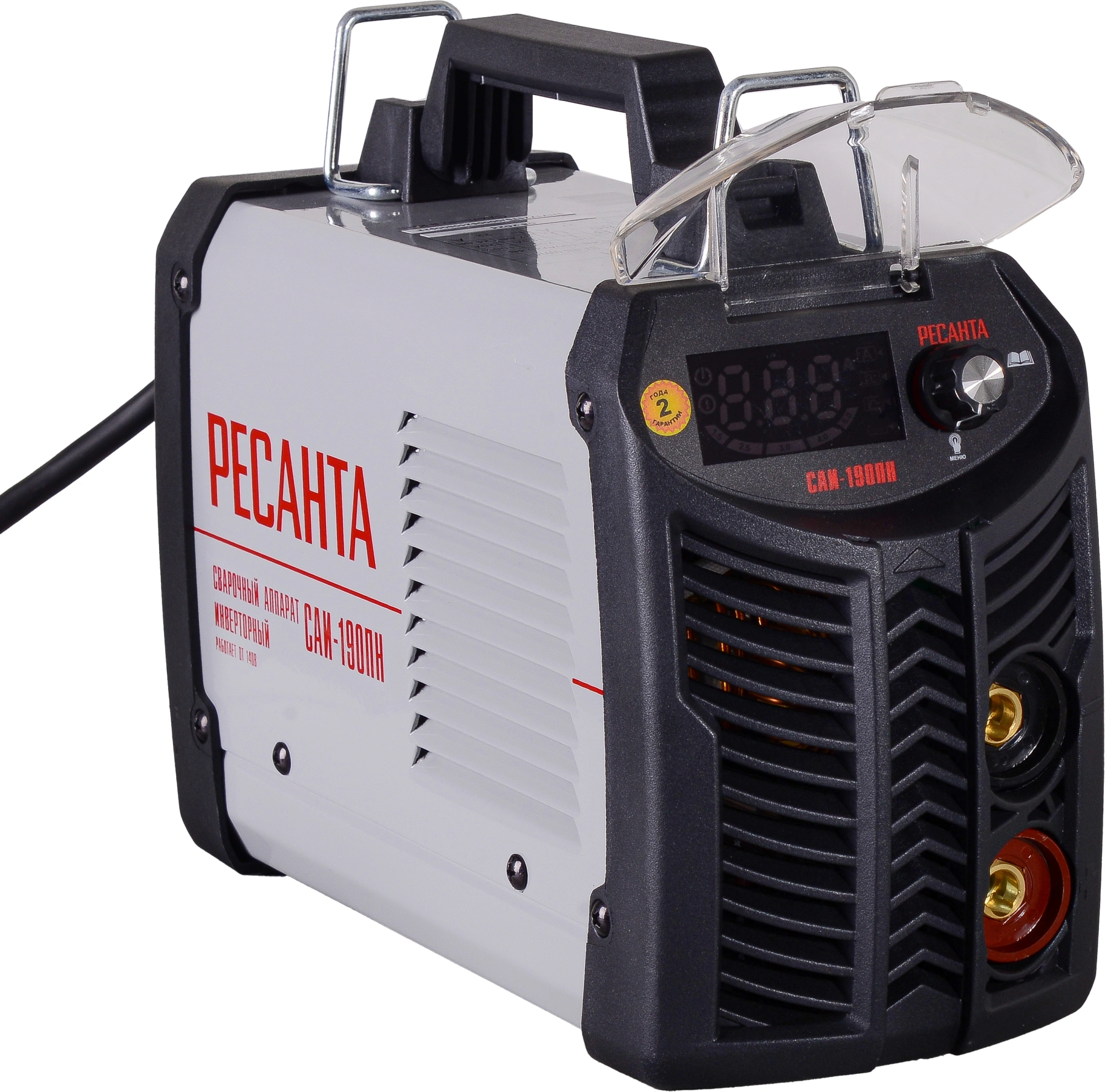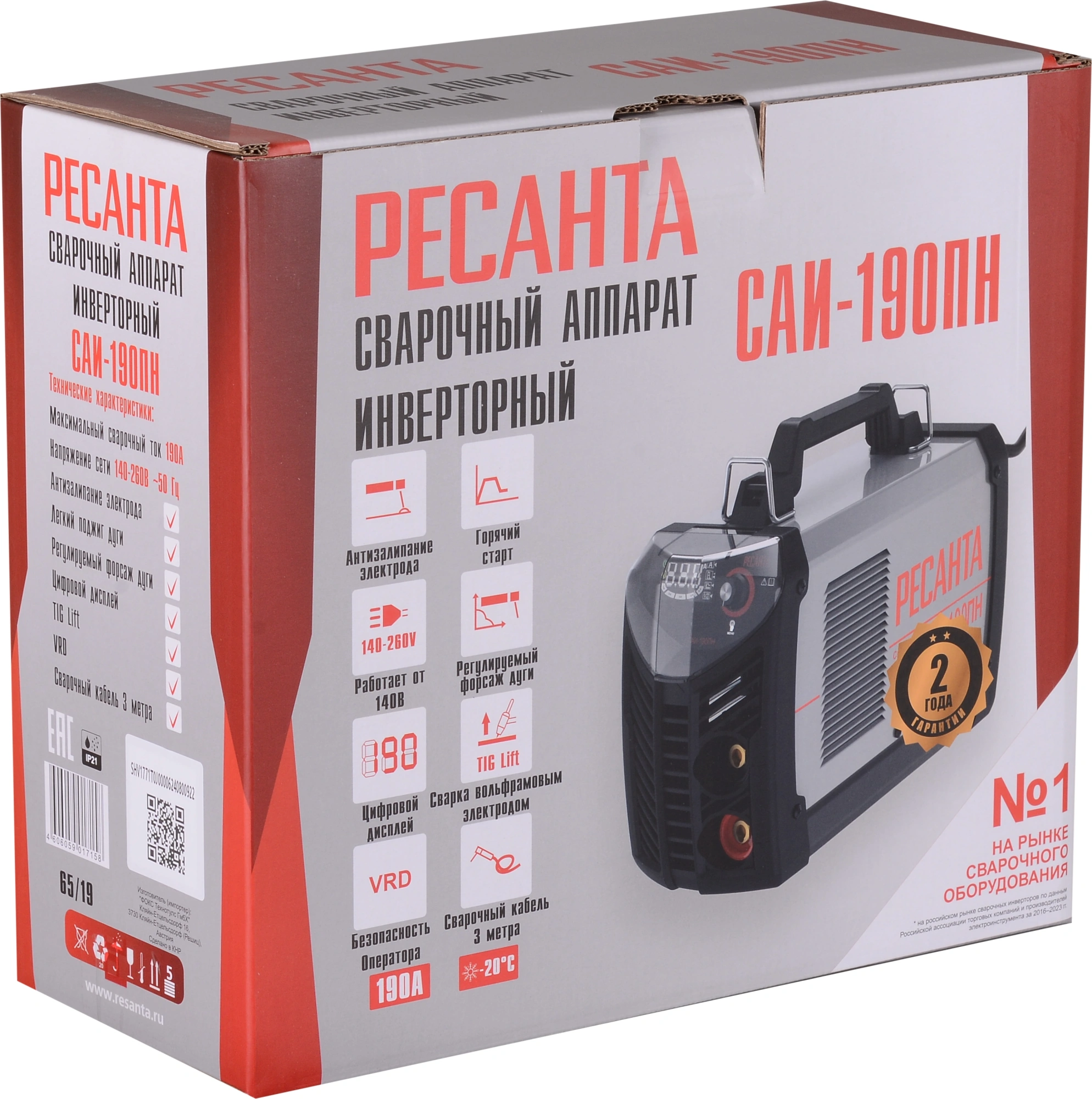 Сварочный аппарат «Ресанта», кабель с электрододержателем, 3 м.; кабель с клеммой заземления, 2,5 м.; паспорт, упаковка.